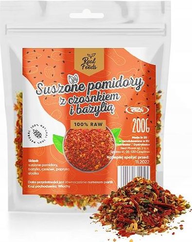 Real Foods - Suszone pomidory z czosnkiem i bazylią 200g Suszone pomidory z czosnkiem i bazylią Real Foods to aromatyczny dodatek inspirowany włoską kuchnią śródziemnomorską. Bez dodatku soli i cukru, idealnie podkreślają smak past, sałatek, zapiekanek, mięs i sosów, dopełniając ich kolorem i apetycznym wyglądem. Dlaczego warto? Naturalny skład — bez dodatku soli i cukru Bogaty aromat bazylia + czosnek + słodka papryka Wszechstronne użycie — doskonały do dań włoskich, śródziemnomorskich, a także do dekoracji potraw Wygodne opakowanie — strunowy worek zapewniający łatwe przechowywanie i zachowanie świeżości Kraj pochodzenia: Włochy Opakowanie: 200g Dla kogo? Suszone pomidory Real Foods z czosnkiem i bazylią to świetny wybór dla miłośników smaków kuchni włoskiej, którzy cenią naturalne i aromatyczne dodatki. Idealne dla osób pragnących szybko wzbogacić swoje dania – domowe obiady, spotkania z przyjaciółmi, sałatki, sosy i nie tylko. Skład: pomidory suszone, bazylia, czosnek, papryka słodka. Sposób użycia: Dodaj do makaronów, pizzy, zup, sałatek, zapiekanek i sosów dla intensywnego smaku i koloru Można je także pokroić i zmiksować z oliwą jako baza pesto lub pasta na bruschettę Świetnie komponują się z oliwą, serem, czarnymi oliwkami i świeżą bazylią w daniach na ciepło i zimno Uwagi: Przechowywać w suchym, chłodnym miejscu, w szczelnie zamkniętym opakowaniu Mimo braku soli w składzie, smak jest intensywny — używaj z umiarem Produkt może zawierać śladowe ilości innych alergenów — ważne dla alergików