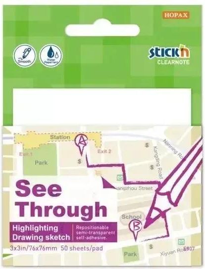 Przezroczysty, bezbarwny notes samoprzylepny zawierający 50 karteczek o wielkości 76 x 76 mm. Przezroczyste karteczki są idealne do odrysowywania małych rysunków. Można też robić na nich krótkie notatki lub zostawiać wiadomości. Po przyklejeniu nie zakrywają treści umieszczonych pod karteczką. Do …