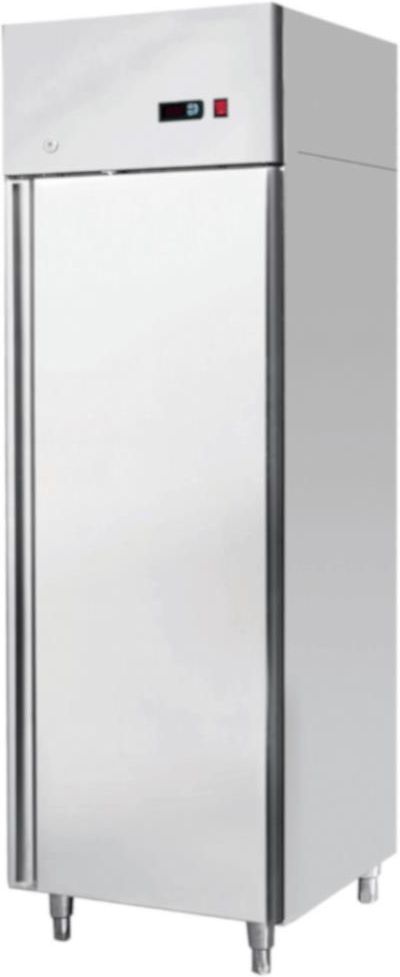 Gastronomiczna szafa mroźnicza MBF o pojemności 670 litrów z agregatem umieszczonym u góry. Wyposażona jest w chłodzenie nawiewowe (wymuszone wentylatorem) oraz automatyczne odszranianie i odparowywanie skroplin. Szafa jest przystosowana do pojemników gastronomicznych GN 2/1. Obudowa oraz wnętrze szafy wykonane są ze stali nierdzewnej. obudowa oraz wnętrze w całości wykonane z blachy nierdzewnej elektroniczne sterowanie z cyfrowym wyświetlaczem temperatury wyłącznik wentylatora po otwarciu drzwi chłodzenie nawiewowe (wymuszone wentylatorem) energooszczędny i cichy agregat skraplający EMBRACO/ASPERA automatyczne odszranianie sterowanie: elektroniczne z cyfrowym wyświetlaczem temp. (ster. CAREL) automatyczne odparowanie skroplin półki rusztowe GN2/1 (metalowe - plastyfikowane) 3szt. samozamykające się drzwi zamek drzwi na klucz regulowane nogi w zakresie do 50 mm klasa klimatyczna 5