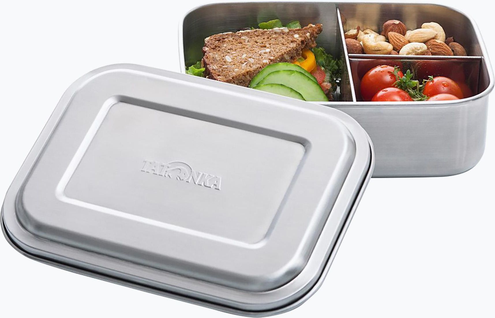 Tatonka Lunch Box to wygodny i funkcjonalny pojemnik na jedzenie. Nie potłucze się, nie będzie absorbował zapachów. Można zabrać go do pracy, szkoły lub na wypad za miasto. Pojemnik na jedzenie Tatonka Lunch Box – posiłek na wyciągnięcie ręki Dzięki solidnej stalowej konstrukcji, trzem komorom, litrowej pojemności oraz pokrywce pozwoli w higieniczny i wygodny sposób przenieść i zjeść śniadanie lub lekki obiad. Lunch Box jest bezpieczny dla żywności, odporny na kwasy owocowe, wolny od BPA. Można go myć w zmywarce.