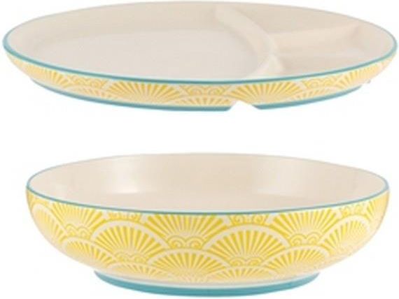 Miska + talerz World Foods Typhoon Podstawowe informacje Producent: Typhoon Kod produktu: 1402.127 Kolor: różne Materiał: ceramika Wymiary: 7,8 x 23 cm (wys. x śr.) Pojemność: 0,85 l Zestaw do dań azjatyckich World Foods Typhoon składa się z miski i talerza Możesz w nich przygotować np. ramen i danie z ryżem lub makaronem ryżowym. Miska mieści 850 ml, natomiast talerz jest podzielony na 3 sekcje. Dzięki takiej budowie rozdzielisz np. sypki ryż od sosu oraz surówki. Naczynia zostały wykonane z kamionki dekorowanej wzorami w kolorze żółtym. Całości dopełnia niebieska lamówka. Komplet należy myć ręcznie. Zestaw do dań azjatyckich World Foods Typhoon nadaje się jako prezent Wiele osób lubi kuchnię azjatycką, dlatego ten komplet sprawdzi się jako podarunek. Ucieszą się z niego miłośnicy kurczaka pad thai, tteobokki czy jajangmyeon.