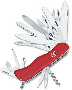 Scyzoryk Victorinox 28 funkcji Wieczysta gwarancjaScyzoryk Victorinox Funkcje 1. duży blokowany nóż 2. korkociąg 3. otwieracz do puszek z: 4. - małym śrubokrętem płaskim 5. otwieracz do butelek z: 6. - blokowanym śrubokrętem płaskim (6mm) 7. - ściągaczem do izolacji 8. szpikulec - szydło, rozwiercacz 9. kółko 10. pęsetka 11. wykałaczka 12. piłka do drewna 13. nożyczki 14. długi wąski śrubokręt krzyżakowy 15. piłka do metalu z: 16. - pilniczkiem do metalu 17. - przyrządem do czyszczenia paznokci 18. kombinerki z: 19. - przecinakiem drutu 20. - zaciskaczem ciężarków 21. śrubokręt krzyżakowy (Philips) 22. mini-śrubokręt 22. otwieracz szekli z : 23. - końcówką do rozwiązywania węzłów 24. kopystka (narzędzie do czyszczenia kopyt) 25. zakrzywione falowane ostrze 26. nóż do papieru / wielofunkcyjny 27. otwieracz do puszek i kapsli z śrubokrętem 5mm 28. mały śrubokręt 2mm Wieczysta gwarancja