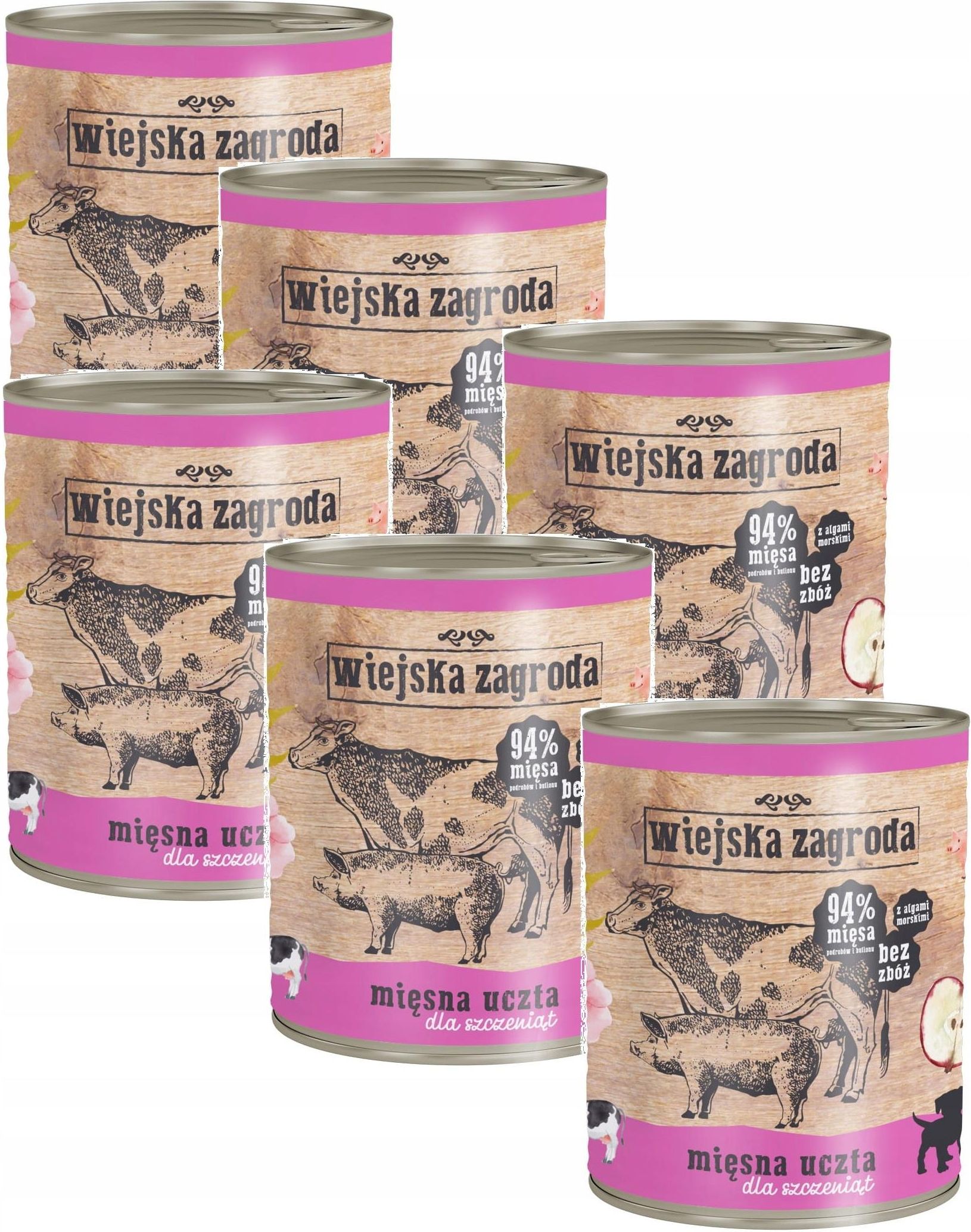 Wiejska Zagroda dla SZCZENIĄT MIĘSNA UCZTA 6x800g Przeznaczenie: Codzienne pożywienie dla szczeniąt wszystkich ras. Cechy: wysoka zawartość mięsa, bez zbóż, bez glutenu, bez GMO, z dodatkiem alg morskich Skład: wołowina 24% (mięso, płuca, nerki), indyk 24% (mięso, serca), wieprzowina 22% (wątróbka, płuca), bulion mięsny 23,9%,jabłka 4%,minerały 1%,inulina 0,3%,olej z łososia 0,7%,algi morskie (spirulina) 0,1%. Składniki Analityczne: białko surowe: 12,3% oleje i tłuszcze surowe: 8,1% popiół surowy: 2,2% włókna surowe: 0,5% wilgotność: 77,5% wapń: 0,29% fosfor: 0,22% Pies zawsze musi mieć dostęp do świeżej wody. Podawaj w temperaturze pokojowej. Przechowuj w suchym i chłodnym miejscu. Dodatki dietetyczne: L-karnityna – 150, witamina D3 - 200 IE, cynk jako monohydrat siarczanu cynku – 15, mangan jako monohydrat siarczanu manganu (II) – 3, jod jako bezwodny jodan wapnia – 0,75., Energia metaboliczna 115,58 kcal/100g Dodatkowe informacje: Dla naszych szczeniaków proponujemy prawdziwą mięsną ucztę. Połączenie cechującego się dużą przyswajalnością białka oraz dużą zawartością żelaza wołowiny, lekkostrawnego indyka oraz bogatej w cenne witaminy wieprzowiny to zdrowy start dla naszych Czworonogów. Wartościowym dodatkiem do mięsnej uczty jest świeży olej z łososia, czyli bogactwo kwasów tłuszczowych Omega 3 EPA i DHA, cennych dla sierści i skóry Twojego psa. Kolejnym wyjątkowym składnikiem są dobroczynne algi morskie, które stanowią bogactwo witamin, minerałów oraz wartościowych substancji odżywczych. Nasze zalety: - bez zbóż, bez glutenu - bez GMO - lśniąca sierść, dzięki dodatkowi oleju z łososia - dodatek alg morskich (spiruliny) bogatych w witaminy i minerały - połączenie wyselekcjonowanych zdrowych mięs - proste składniki - polska marka Poznaj supermoce naszych składników: Wołowina – mięso wołowe cechuje się dużą wartością łatwo przyswajalnego białka. Zawiera wiele składników mineralnych, takich jak żelazo, potas i wapń oraz jest bogate w kwas linolowy oraz cholinę, dbającą o sprawność funkcji poznawczych Psiaka, przede wszystkim pamięci. Mięso indyka - jest delikatnym, najchudszym z mięs, a jednocześnie łatwo przyswajalnym źródłem białka. Wieprzowina – jest źródłem żelaza oraz takich witamin jak B6, B12, A i D. Jabłka – cechują się dużą zawartością błonnika, który reguluje pracę jelit oraz są źródłem wielu cennych witamin: A, C, K. L-karnityna – cenny składnik w okresie dojrzewania, pomaga w utrzymaniu odpowiedniej wagi. Świeży olej z łososia - bogactwo kwasów tłuszczowych Omega 3 EPA i DHA, cennych dla sierści i skóry Twojego psa. Algi morskie – cenne źródło witamin, minerałów oraz substancji odżywczych, w tym wartościowych kwasów Omega-6 oraz B-karotenu. Przechowuj w chłodnym i suchym miejscu. Po otwarciu trzymaj w lodówce max. 24 h.
