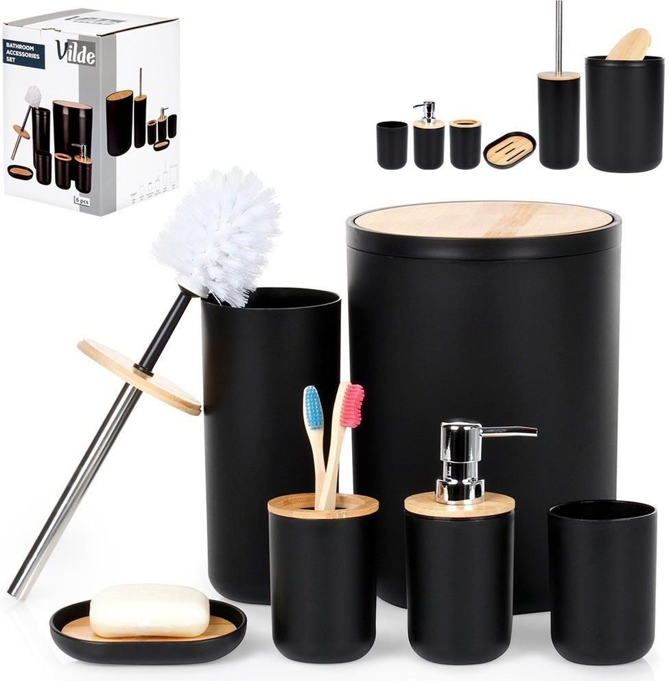 Zestaw ŁAZIENKOWY kubek szczotka WC kosz na śmieci kubek dozownik mydła 6el Kod produktu: 568053 Najważniejsze informacje Zestaw 6 el. akcesoriów łazienkowych - Zestaw akcesoriów łazienkowych, składający się z: dozownika na mydło, mydelniczki, kubka na przybory np. szczoteczki lub pastę, dodatkowego kubka, szczotki do toalety z pojemnikiem oraz kosza na śmieci z uchylną klapką. Odporny i wytrzymały - Zestaw wykonany jest z najwyższej jakości tworzywa w czarnym, matowym kolorze, a dodatki wykonane z drewna bambusowego. Połączenie koloru czarnego i drewna dodają elegancji i ciepła każdej łazience. Przydatny w każdej łazience - Zestaw zapewnia praktyczne rozwiązania do przechowywania niezbędnych przyborów łazienkowych przy jednoczesnym zachowaniu estetycznego wyglądu. Idealne rozwiązanie do utrzymania porządku w łazience. Modny design - Zestaw łazienkowy wykonany w nowoczesnym, minimalistycznym stylu, dodaje wnętrzu wyjątkowego charakteru. Pasuje do każdego wnętrza łazienki. Łatwe czyszczenie - Zestaw jest łatwy w czyszczeniu, wystarczy przetrzeć wilgotną szmatką, aby usunąć zanieczyszczenia, co gwarantuje utrzymanie higieny i estetycznego wyglądu na dłużej. Szczotka jest odkręcana. Komplet 6 akcesoriów łazienkowych przydatnych w każdym domu. W zestawie: 1x dozownik na mydło (7,5 x 16,5 cm, pojemność 320 ml ), 1x kubek na przybory (7,5 x 10,5 cm, pojemność 320 ml), 1x kubek (7,5 x 10 cm, pojemność 320 ml), 1x mydelniczka (13,5 x 8,5 x 2 cm), 1x kosz na śmieci (19,5 x 27 cm, pojemność 8 l) 1x szczotka do toalety ze stojakiem (10 x 40 cm). Przydatne w każdym domu. Solidnie wykonane będą stanowić wyjątkowy element dekoracyjny. Akcesoria prezentują się bardzo elegancko i są utrzymane w modnej kolorystyce. Klasyczny kształt sprawia, że pasują do każdego wnętrza. Oryginalny produkt marki Vilde. Wyprodukowano zgodnie z europejskimi standardami. Materiał: tworzywo Waga (g): 1070 Kolor dominujący: czarny Vilde - better every day! Vilde to europejska marka produktów wyposażenia domu i ogrodu. W naszej ofercie znajdują się artykuły do kuchni, łazienki, przedpokoju, sypialni, dekoracje oraz produkty sezonowe. Produkty marki Vilde podążają za aktualnymi trendami i wymaganiami Konsumentów. Nasze wzory wyznaczają najnowsze trendy, a produkty są najwyższej jakości w przystępnej cenie. Firma Vilde powstała z połączenia pasji, konsekwencji, determinacji oraz wykwalifikowanych i profesjonalnych ludzi, którzy tworzą firmę. Fundamentem Naszego sukcesu jest pasja, profesjonalizm, ale również pracowitość, zrozumienie Klienta oraz olbrzymie doświadczenie w branży.