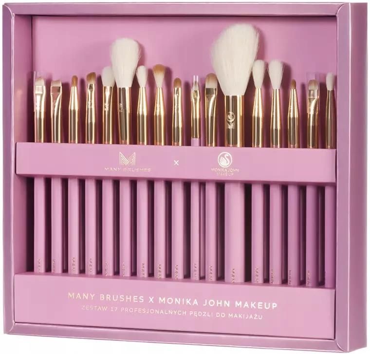 Zestaw 17 profesjonalnych pędzli powstałych we współpracy marki Many Brushes i doświadczonej makijażystki Moniki John. Najwyższej jakości włosie oraz kształty dobrane przez naszą ekspertkę tak, aby jak najbardziej zoptymalizować pracę z makijażem. W zestawie znajdziesz zarówno pędzle z naturalnego koziego włosia premium, jak i te wykonane z syntetycznych włókien najwyższej jakości - sprężystych Straight Fibers i puszystych Smooth Touch. MJ-01 - Straight Fibers - Mały pędzel do precyzyjnej pracy oraz malowania pojedynczych włosków brwi MJ-02 - Straight Fibers - Pędzel do czyszczenia krawędzi i nanoszenia kresek MJ-03 - Straight Fibers - Pędzel do malowania dolnej powieki i kącików oka MJ-04 - Smooth touch - Skośny pędzelek do blendowania dolnej powieki MJ-05 - Premium Goat Hair - Wielozadaniowy pędzel do blendowania cieni i pudrowania okolic oczu MJ-06 - Premium Goat Hair - Pędzel do prasowanego pudru, rozświetlacza różu i bronzera MJ-07 - Premium Goat Hair - Pędzel do rozcierania cieni MJ-08 - Smooth touch - Uniwersalny pędzel do blendowania oraz nanoszenia mokrych produktów MJ-09 - Straight Fibers - Pędzel do malowania kącików oka oraz czyszczenia konturów brwi i ust MJ-10 - Straight Fibers - Precyzyjny pędzel do detali i kresek MJ-11 - Straight Fibers - Płaski pędzel do kremowych produktów - pomadek i korektorów MJ-12 - Premium Goat Hair - Wielozadaniowy pędzel do pudrowych produktów, różu i bronzera MJ-13 - Premium Goat Hair - Mniejszy pędzel do blendowania MJ-14 - Premium Goat Hair - Większy pędzel do blendowania MJ-15 - Straight Fibers - Pędzel typu pencil brush do detali MJ-16 - Straight Fibers - Płaski pędzel do detali i czyszczenia krawędzi MJ-17 - Mix - Premium Goat Hair / Smooth Touch - Precyzyjny płaski pędzel do czyszczenia krawędzi oka / cut crease MYCIE I SUSZENIE: Pędzle powinno się umyć możliwie jak najszybciej po każdym użyciu za pomocą dedykowanych do tego środków czyszczących. Myć należy główkami do dołu, poniżej górnej granicy skuwki tak, aby nie zamoczyć drewnianego trzonka. Nie namaczać pędzli długotrwale wodzie. Po umyciu nie odwracać do góry nogami, nie zalewać wrzątkiem, ani czyścić przy pomocy silnych detergentów, alkoholu, rozpuszczalników. Zalecana temperatura wody to 40°C. Po każdym czyszczeniu dokładnie wypłukać wodą i osuszyć ręcznikiem papierowym. Suszyć w pozycji pionowej włosiem do dołu. Nie suszyć na grzejniku, suszarką lub na słońcu. Pędzle z włosia kozy mogą przed pierwszym użyciem gubić pojedyncze włoski, jest to ich naturalną właściwością.
