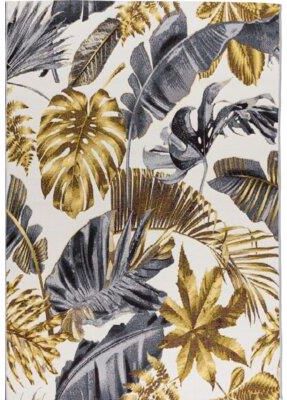 Dywan zewnętrzny Cappucino marki MULTIDECOR o wymiarach 120 x 180 cm w kształcie prostokąta, tkany na płasko. Roślinne wzory w odcieniach złoto-beżowych nadają mu egzotycznego charakteru i wprowadzają klimat tropikalnego raju.
