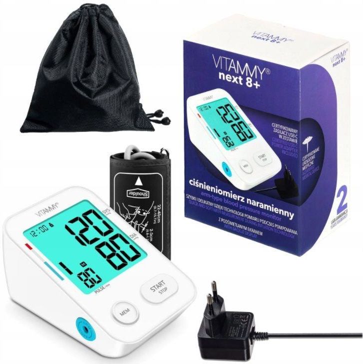 VITAMMY NEXT 8+ Ciśnieniomierz naramienny z pomiarem podczas pompowania i zasilaczem w zestawie W trosce o jak najwyższą jakość i w pogoni za najnowszymi technologiami wciąż udoskonalamy serię naszych urządzeń do pomiaru ciśnienia. Celem wprowadzania nowych bardziej skutecznych rozwiązań stworzyliśmy nową odsłonę znanego i sprawdzonego ciśnieniomierza z serii NEXT. Spokój i poczucie bezpieczeństwa to szansa na wiarygodność wyników! Sprawdź dlaczego warto zaufać marce VITAMMY i wybrać ciśnienieniomierz NEXT 8+. Pomiar Podczas Pompowania - technologia następnej generacji w NEXT 8+ NEXT 8+ to ciśnieniomierz naramienny, który niezwykle delikatnie, szybko i precyzyjnie zmierzy ciśnienie krwi, dzięki technologii pomiaru podczas pompowania, zwanej także pomiarem komfortowym.  Pomiar podczas pompowania wykonywany jest w czasie, gdy urządzenie napełnia mankiet. Użytkownik odczuwa niewielki ucisk, a jest znacznie bardziej delikatny i zauważalnie szybszy.  Użytkowanie tego ciśnieniomierza kojarzy nie kojarzy się z dyskomfortem. Znacznie przyjemniej jest kontrolować ciśnienie krwi z NEXT 8 z pomiarem podczas pompowania niż ciśnieniomierzem starszej generacji.  NEXT 8+ z kompletnej serii NEXT z technologią następnej generacji: Inflation Measurement (Pomiaru Podczas Pompowania) Sygnalizacja położenia mankietu W kilka sekund po rozpoczęciu pomiaru sygnalizuje, czy mankiet został założony prawidłowo, czy nieprawidłowo. Niweluje najczęściej występującą przyczynę błędnych wskazań lub błędów podczas pomiaru: nieprawidłowo założony mankiet: zbyt luźny, zbyt ciasny lub niewłaściwie ułożony. Wykrywanie poruszenia podczas pomiaru (oraz zakłóceń na skutek mówienia) Po zakończeniu pomiaru wskazuje, że podczas pomiaru użytkownik nie pozostawał w wystarczającym bezruchu lub mówił, co mogło mieć wpływ na wyświetlany wynik oraz fałszywie dodatnie wskazanie występowania arytmii. Pokazuje, że uzyskany wynik został w pewnym stopniu zakłócony. Zwiększa wiarygodność urządzenia i wiarygodność pomiaru. Poprawia technikę wykonywania pomiaru. Uśrednianie 3 ostatnich wyników Pozwala zniwelować wpływ niekorzystnych zjawisk (jak efekt białego fartucha) na pojedynczy pomiar. Łatwa obsługa i czytelny ekran Pogoń za technologicznymi nowinka wcale nie oznacza skomplikowanej obsługi i wielu przycisków. Z zewnątrz ciśnieniomierz ma tradycyjny wygląd i podpisane przyciski, które sugerują jak należy go używać.