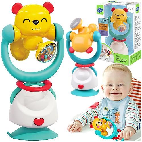 Grzechotka plastikowa Miś z przyssawką to kolorowa, interaktywna zabawka stworzona specjalnie z myślą o najmłodszych dzieciach, która łączy funkcję zabawy i wspomaga rozwój sensoryczny malucha. Dzięki uroczej formie i przemyślanym elementom, doskonale nadaje się do codziennego użytku zarówno w domu, jak i podczas posiłków. Główne cechy Kształt Misia: Zabawka zaprojektowana w kształcie uroczego misia, który przyciąga uwagę dziecka, zachęcając je do zabawy. Jasne, kontrastowe kolory stymulują rozwój wzroku u malucha. Funkcja grzechotki: Wewnątrz misia znajduje się element grzechoczący, który wydaje dźwięki podczas poruszania zabawką, co pomaga rozwijać zmysł słuchu oraz motorykę dziecka. Przyssawka: Solidna przyssawka umożliwia łatwe przymocowanie zabawki do gładkich powierzchni, takich jak stolik, krzesełko do karmienia czy podłoga. Dzięki temu zabawka nie przewraca się i nie spada, zapewniając maluchowi bezpieczną zabawę. Obrotowy element: Górna część misia jest ruchoma i może się obracać, co dodatkowo zwiększa atrakcyjność zabawki, wspomagając rozwój koordynacji ruchowej dziecka. Wielofunkcyjność: Zabawka łączy funkcję grzechotki z funkcjonalnością stabilnej przyssawki, co czyni ją wszechstronną pomocą w rozwoju umiejętności manualnych oraz zabawie sensorycznej. Może być używana zarówno w czasie zabawy, jak i podczas posiłków. Bezpieczne materiały: Wykonana z wysokiej jakości plastiku wolnego od BPA i innych szkodliwych substancji, grzechotka jest w pełni bezpieczna dla małych dzieci i łatwa do utrzymania w czystości. Korzyści rozwojowe Stymulacja wzroku i słuchu: Dzięki kolorom i dźwiękom grzechotki, zabawka wspomaga rozwój zmysłów. Rozwój motoryki: Maluch ćwiczy swoje zdolności manualne poprzez poruszanie i obracanie elementów zabawki. Bezpieczeństwo i wygoda: Stabilność zapewniana przez przyssawkę pozwala na bezpieczną zabawę w dowolnym miejscu. Idealna do zabawy zarówno w domu, jak i w trakcie posiłków, jest doskonałym wyborem dla maluszków, które zaczynają odkrywać otaczający je świat dźwięków, kształtów i kolorów. Wymiary opakowania - 23 x 15 x 10,5 cm