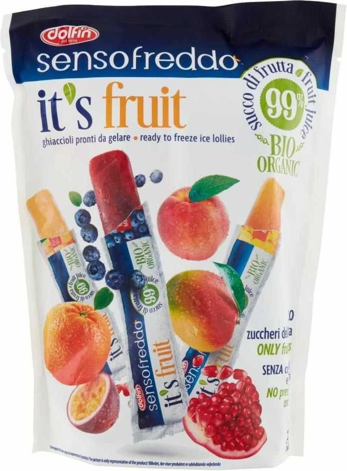 LODY OWOCOWE DO ZAMROŻENIA BIO Produkt pasteryzowany Zawartość netto: 400 ml (10 x 40 ml) Składniki: Smak pomarańcza-mango. Składniki: sok z białych winogron z koncentratu* 50 %, sok jabłkowy z koncentratu* 40 %, sok pomarańczowy z koncentratu* 6 %, puree z mango* 3 %, substancja zagęszczająca: guma guar*, naturalny aromat mango*. Smak jagoda-granat. Składniki: sok z białych winogron z koncentratu* 50 %, sok jabłkowy z koncentratu* 40 %, puree z jagód* 8,5 %, sok z granatu z koncentratu* 0,5 %, substancja zagęszczająca: guma guar*, naturalny aromat z owoców leśnych*. Smak brzoskwinia-marakuja. Składniki: sok z białych winogron z koncentratu* 50 %, sok jabłkowy z koncentratu* 40 %, sok z brzoskwini z koncentratu* 5 %, sok z marakui z koncentratu* 2 %, substancja zagęszczająca: guma guar*, naturalny aromat brzoskwiniowy*. * Składniki z certyfikowanej uprawy ekologicznej Jednostka certyfikująca: IT-BIO-008 Pochodzenie surowców: Rolnictwo UE/ spoza UE Sposób użycia: W celu uzyskania lodów należy umieścić produkt w zamrażarce w temperaturze -18 stopni Celsjusza na około 3 godziny. Po wyjęciu z zamrażarki poczekać kilka minut i rozerwać opakowanie wzdłuż linii. Warunki przechowywania: Przed zamrożeniem przechowywać w suchym i chłodnym miejscu. Może zawierać osad spowodowany naturalną sedymentacją soku owocowego. Wartość odżywcza w 100 ml produktu: Wartość energetyczna: 280 kJ/ 67 kcal Tłuszcz: 0 g - w tym kwasy tłuszczowe nasycone: 0 g Węglowodany: 17,5 g - w tym cukry: 15 g Białko: 0 g Sól: 0 g Producent: Dolfin S.p.A. S.S. 114 km 71,043 95018 Carruba Riposto (CT) Włochy