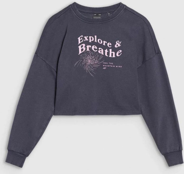 Bluza dresowa nierozpinana bez kaptura dziewczęca 4F Dziewczęca bluza dresowa bez kaptura to uniwersalny element garderoby, który doskonale sprawdzi się zarówno w codziennych, casualowych stylizacjach, jak i w sportowym wydaniu. Nierozpinany fason oraz klasyczny krój typu regular zapewniają wygodne dopasowanie do sylwetki i pełną swobodę ruchów. Bluza została uszyta z miękkiej dzianiny typu french terry – z jednej strony gładkiej, z drugiej o charakterystycznej pętelkowej strukturze. Materiał o średniej gramaturze 280 g/m² jest przyjemny w dotyku, lekki i przewiewny, dzięki czemu sprawdzi się o każdej porze roku. Model wykonano z wysokiej jakości mieszanki materiałów: 80% bawełny, która gwarantuje komfort noszenia, oraz 20% poliestru, zwiększającego trwałość i odporność na odkształcenia. Dzięki temu bluza zachowuje swój fason nawet po wielu praniach i dłuższym użytkowaniu. Szczegóły: Gramatura: 280 gsm. Wnętrze bez podszycia. Krój regular, który wygodnie dopasowuje się do sylwetki. Skrócony fason cropped, który sięga do linii talii. Wykonana w 80% z bawełny. Dodatek poliestru (20%). Dzianina dresowa french terry na. Okrągły dekolt ze ściągaczem. Mankiety ze ściągaczem. Nadruk z przodu z napisem "Explore & Breathe". Bez kieszeni. Wkładana przez głowę. Obniżona linia ramion. Materiał dodatkowy: Bawełna 95%, Elastan 5% Materiał główny: Bawełna 80%, Poliester 20% TSWSF1483-22S