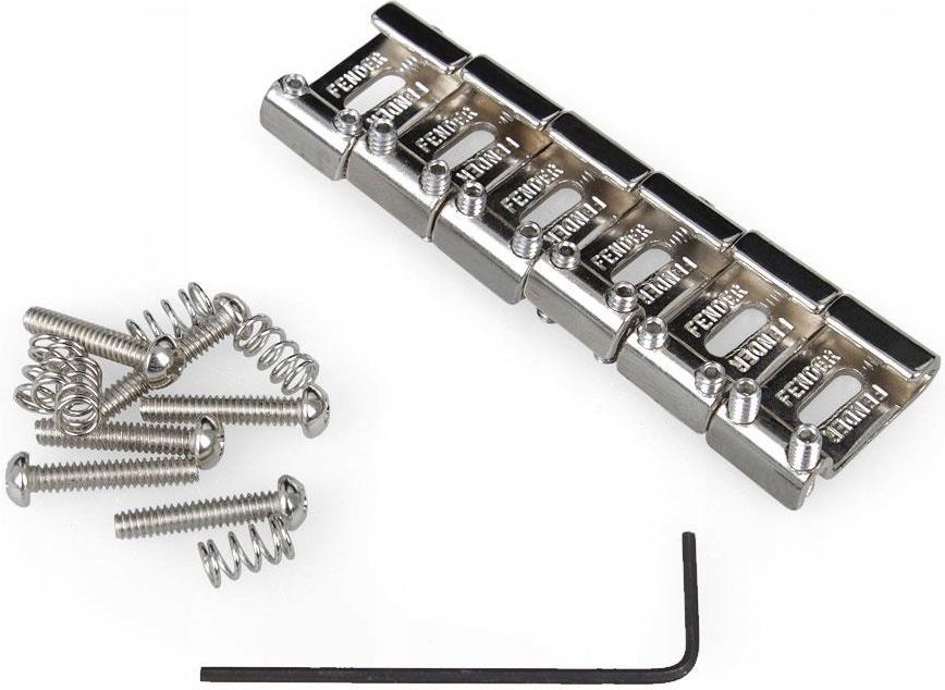 FENDER 0992051000 - zestaw 6 siodełek mostka do gitar Fender, serii American Vintage (od 86' do współczesnych). Wykonane ze stali niklowanej. W komplecie śrubki, sprężynki oraz klucz imbusowy. Otwór śrubki regulacji menzury znajduje się na środku tylnej ścianki. Wymiary - 22 x 11 mm z czego jedno siodełko pod E-6 jest nieco krótsze. Grawerowane logo Fender.