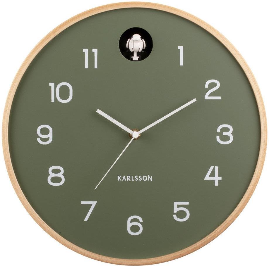Zielony matowy okrągły klasyczny elegancki zegar ścienny z kukułką Karlsson KA5886GR Natural Cuckoo. Drewniana obudowa. Mechanizm kwarcowy. Elegancki zegar ścienny z głosami natury do salonu, pokoju, sypialni