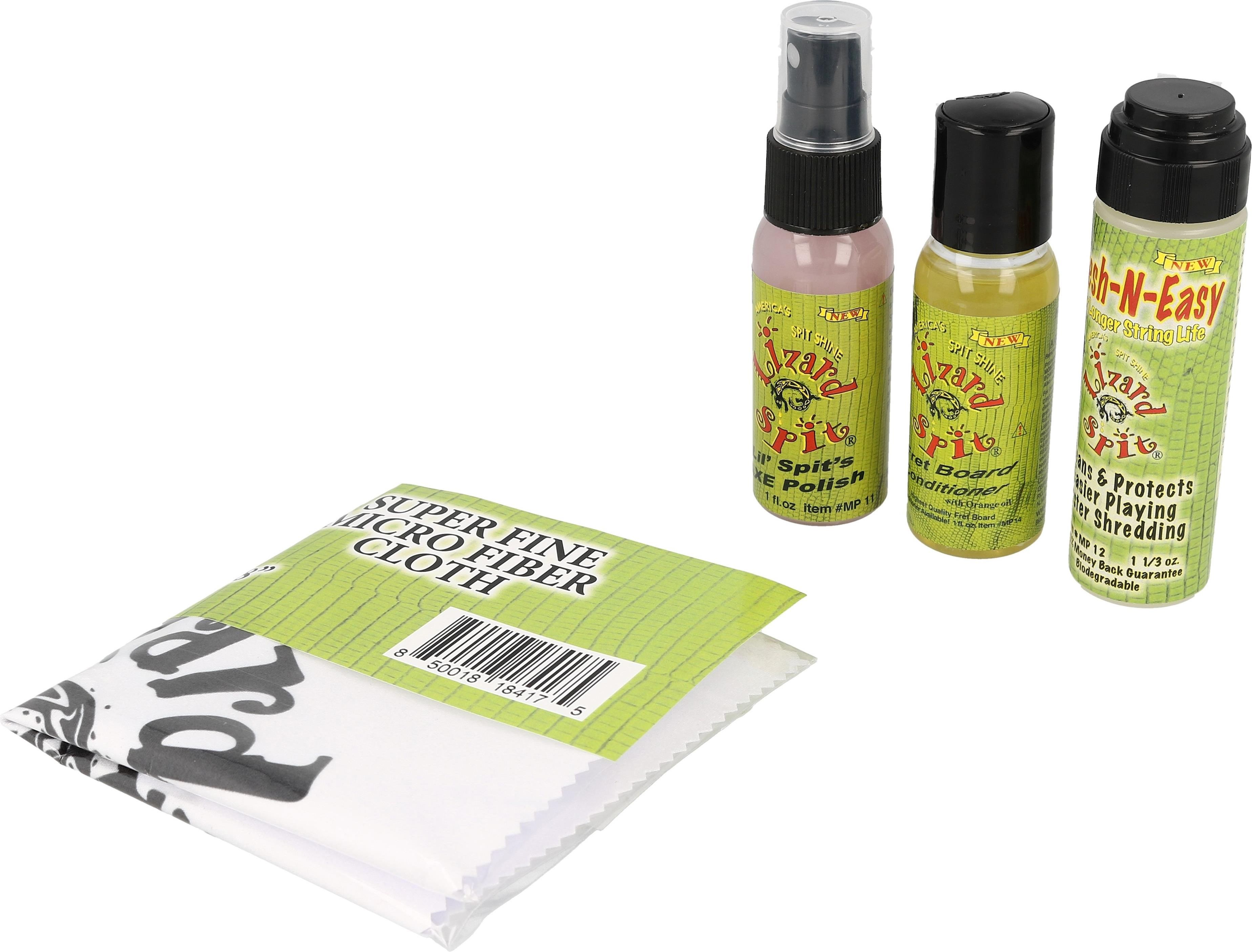Lizard Spit MP-16 - Podróżny Zestaw Do Konserwacji Gitary Preparaty amerykańskiej firmy Lizard Spit są uwielbiane na całym świecie. Oprócz doskonałych właściwości i świetnej skuteczności w czyszczeniu i konserwowaniu instrumentów, cieszą się uznaniem również za ekologiczne podejście do produkcji. Firma wytwarza przyjazne dla środowiska, nietoksyczne, bezpieczne, biodegradowalne produkty do różnych zastosowań. Zestaw do konserwacji gitary. W skład zestawu wchodzą: preparat do czyszczenia gitary, preparat do strun, do podstrunnicy oraz ściereczkę z micro fibry. Niezbędnik każdego muzyka i świetny pomysł na prezent!