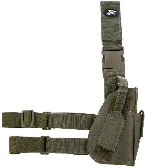 Kabura na pistolet na udo oliwkowa prawa Odpowiednia dla praworęcznych Regulowany uchwyt na pasek z zapięciem na zatrzask 2 regulowane paski na nogę zapinane na zatrzaski z elastycznymi wstawkami i antypoślizgową, gumową powłoką Szlufka na pasek z rzepem ok. 7 cm Zapięcie na rzep i zatrzaski Kieszeń na magazynek z boku zapinana na rzep Materiał: 100% poliester Art.-Nr.: 30725B