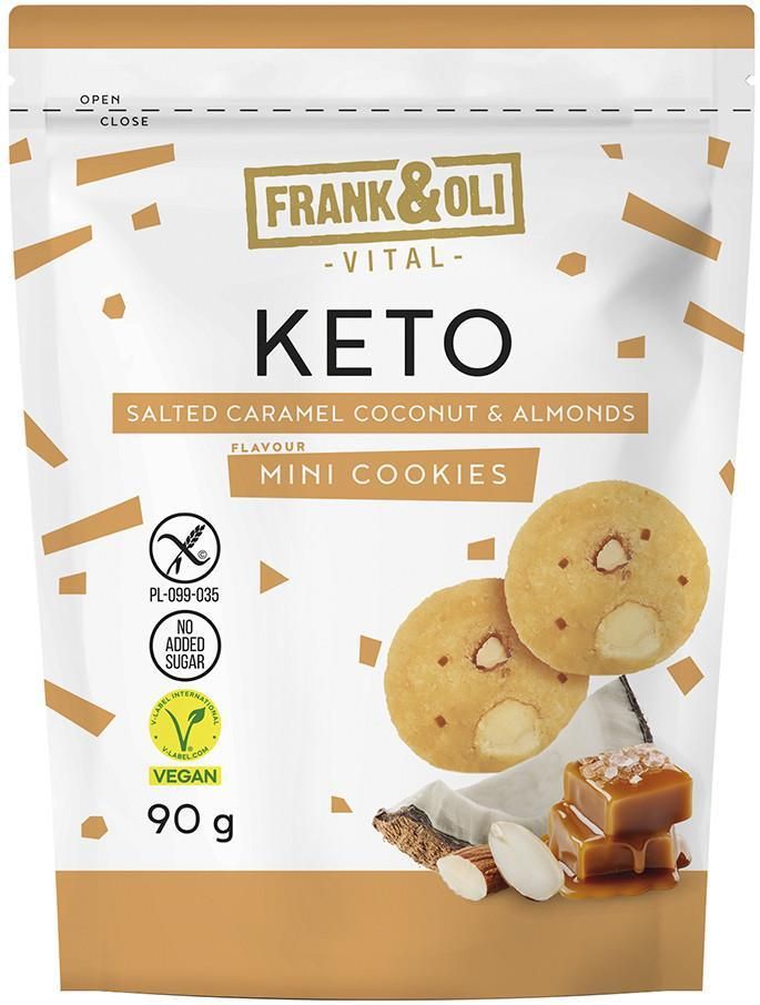 FRANK&OLI Keto Mini Ciasteczka SŁONY KARMEL KOKOS MIGDAŁY Bez Cukru 90g Słodko-słone i pełne smaku – Keto Salted Caramel Coconut & Almonds Mini Cookies to propozycja Frank&Oli dla osób, które chcą jeść świadomie, nie rezygnując z ulubionych smaków. Aromatyczny kokos, chrupiące migdały i delikatna nuta karmelu tworzą pyszną przekąskę idealną dla diety keto, niskowęglowodanowej i wegańskiej. Z naturalnych składników, bez dodatku cukru i glutenu, to doskonały wybór do kawy, w podróży czy w pracy – zawsze wtedy, gdy masz ochotę na coś słodkiego w zdrowej odsłonie. Słony karmel, kokos i migdały – trio idealne Wyjątkowe połączenie aromatycznego kokosa, szlachetnych migdałów i słonego karmelu to kompozycja, której trudno się oprzeć. Produkt ten wyróżnia się nie tylko smakiem, ale wysoką zawartością błonnika z korzenia cykorii pomaga w utrzymaniu zdrowej pracy układu trawiennego i syci na długo. Dodatek mąki migdałowej oraz całych migdałów wprowadza lekką chrupkość, która przyjemnie kontrastuje z delikatną, lekką teksturą ciastek. Mini keto ciasteczka mają aż o 77% mniej węglowodanów niż przeciętne produkty tego typu na rynku – idealne dla osób redukujących spożycie cukru lub włączających się w styl życia keto. Produkty są słodzone maltitolem, nie zawierają dodatku cukrów, a jednocześnie dostarczają wyraźnie wyczuwalnego, zbalansowanego smaku – słodko-słonego, z nutą karmelu i wyraźnego kokosa. Mini ciasteczka - naturalna prostota z krótkim składem Frank&Oli od początku stawia na skład, który nie wymaga tłumaczeń. Mini ciasteczka Keto Salted Caramel Coconut & Almonds to więcej niż modna etykieta. To realna alternatywa dla wszystkich, którzy oczekują jakości, wartości odżywczej i wyjątkowego smaku: bez dodatku cukru bez glutenu w 100% roślinne bez sztucznych dodatków, konserwantów i barwników. Keto ciasteczka słony karmel – mini forma, maksymalna satysfakcja Mini ciasteczka keto w poręcznym strunowym opakowaniu to idealny format na co dzień – łatwo je zabrać ze sobą do pracy, na trening, w podróż czy na spacer. Zawsze pod ręką, zawsze bez wyrzutów sumienia. Zrównoważona formuła oparta na błonniku, zdrowych tłuszczach i naturalnych składnikach, dostarcza nie tylko smaku, ale i dobrego samopoczucia. Skład: kokos 38 % (miazga kokosowa 24 %, wiórki kokosowe 14 %), błonnik z korzenia cykorii, mąka migdałowa, migdały 6 %, substancja słodząca: maltitol, emulgator: lecytyny (z rzepaku), sól himalajska, aromaty naturalne. Alergeny: Produkt może zawierać nasiona sezamu, orzeszki ziemne, inne orzechy i mleko.