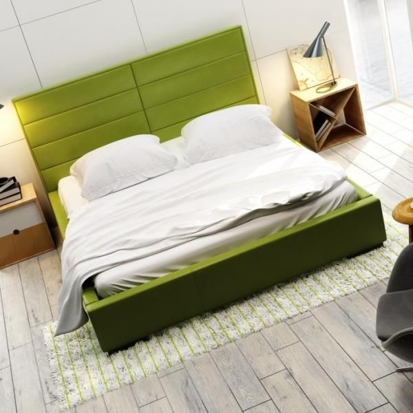 Łóżko tapicerowane z ciekawym wzorem na wezgłowiu.