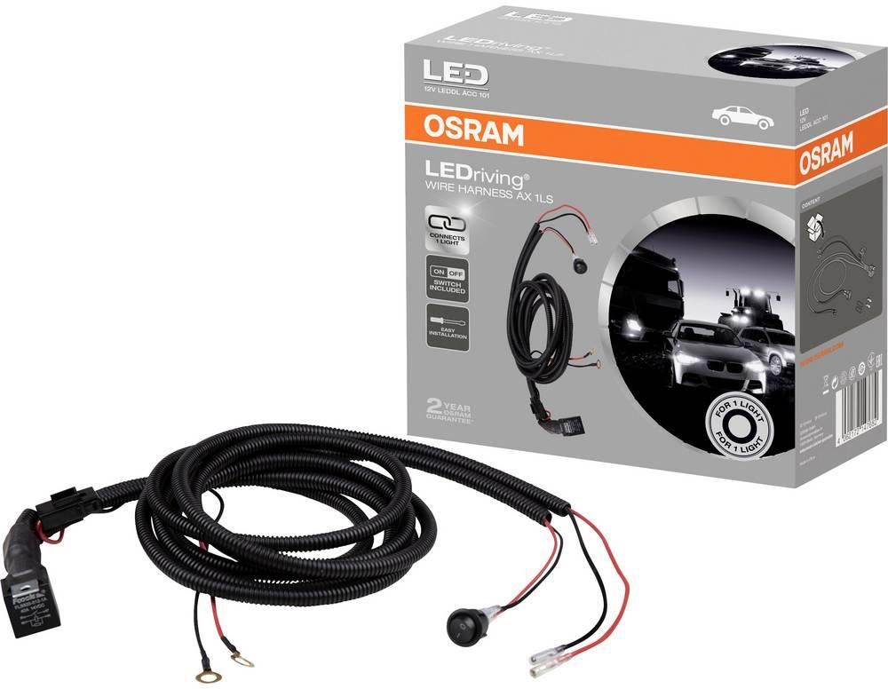 OSRAM LEDriving WIRE HARNESS AX 1LS wiązka ledbar Wiązka nowa, nieużywana, karton delikatnie podniszczony, produkt po zwrocie. Dzięki przewodom OSRAM Wire Harness AX 1LS, lampy drogowe i robocze OSRAM LEDriving można szybko i łatwo zainstalować w odpowiednim pojeździe.OSRAM AX 1LS to wiązka przewodów, która nadaje się do instalacji jednego źródła światła z jedną funkcją oświetlenia. Posiada również zintegrowany przycisk on/off, który można zainstalować w kabinie pojazdu, aby w razie potrzeby włączać lub wyłączać światła robocze OSRAM LEDriving. Włącznika można używać tylko ze światłami roboczymi OSRAM LEDriving. Wiązka przewodów OSRAM AX 1LS jest odpowiednia dla pojazdów 12 V.