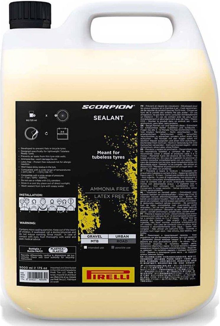 Pirelli Scorpion™ SmartSEAL 5000mlPirelli oferuje pełną gamę uszczelniaczy bezdętkowych, które obejmują wszystkie możliwe zastosowania w kolarstwie: od szosowego modelu P ZERO™ zaprojektowanego do użytku pod wysokim ciśnieniem, po standardowy uszczelniacz (bez amoniaku i lateksu) przeznaczony do zastosowań szutrowych (Cinturato™) i MTB (Scorpion™). Pirelli zdecydowało się na znane nazewnictwo zgodnie z przeznaczeniem, upraszczając w ten sposób orientację w asortymencie.- Nie zawiera amoniaku - nie uszkadza obręczy.- Nie zawiera lateksu i białka - mniejsze ryzyko reakcji alergicznej.- Nie pozostawia lepkiej pozostałości w oponie.- Działa w szerokim zakresie temperatur zewnętrznych (od -20°C/68°F do 70°C/158°F).- Działa w szerokim zakresie ciśnień (od 1 do 7 barów / od 15PSI do 100PSI).- Kompatybilny z CO2 tylko w przypadku awaryjnej naprawy w terenie: CO2 przyspiesza kurczenie się, więc uszczelniacz musi być później wymieniony.- Zalecane zastosowanie: opony MTB, szutrowe, miejskie; Możliwe zastosowanie: opony szosoweZalecana ilość wypełnienia:700 x 23-32 mm - 40-60 ml700 x 33-40mm - 60-80 ml700 x 40-50 mm / 650 x 45-50 mm - 80-100 ml29 x 2,0-2,4" - 100-120 ml29 x 2,4-2,6" - 120-140 ml27,5 x 2,4/2,8 - 110-150 ml