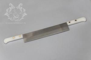 Nóż do sera POLKARS INOX Rękojeść: wykonana z polietylenu Kolor rękojeści: biały Ostrze: błyszczące Długość ostrza: 330 mm Długość całkowita: 610 mm (ostrze plus dwie rączki) Zastosowanie: krojenie bloków sera