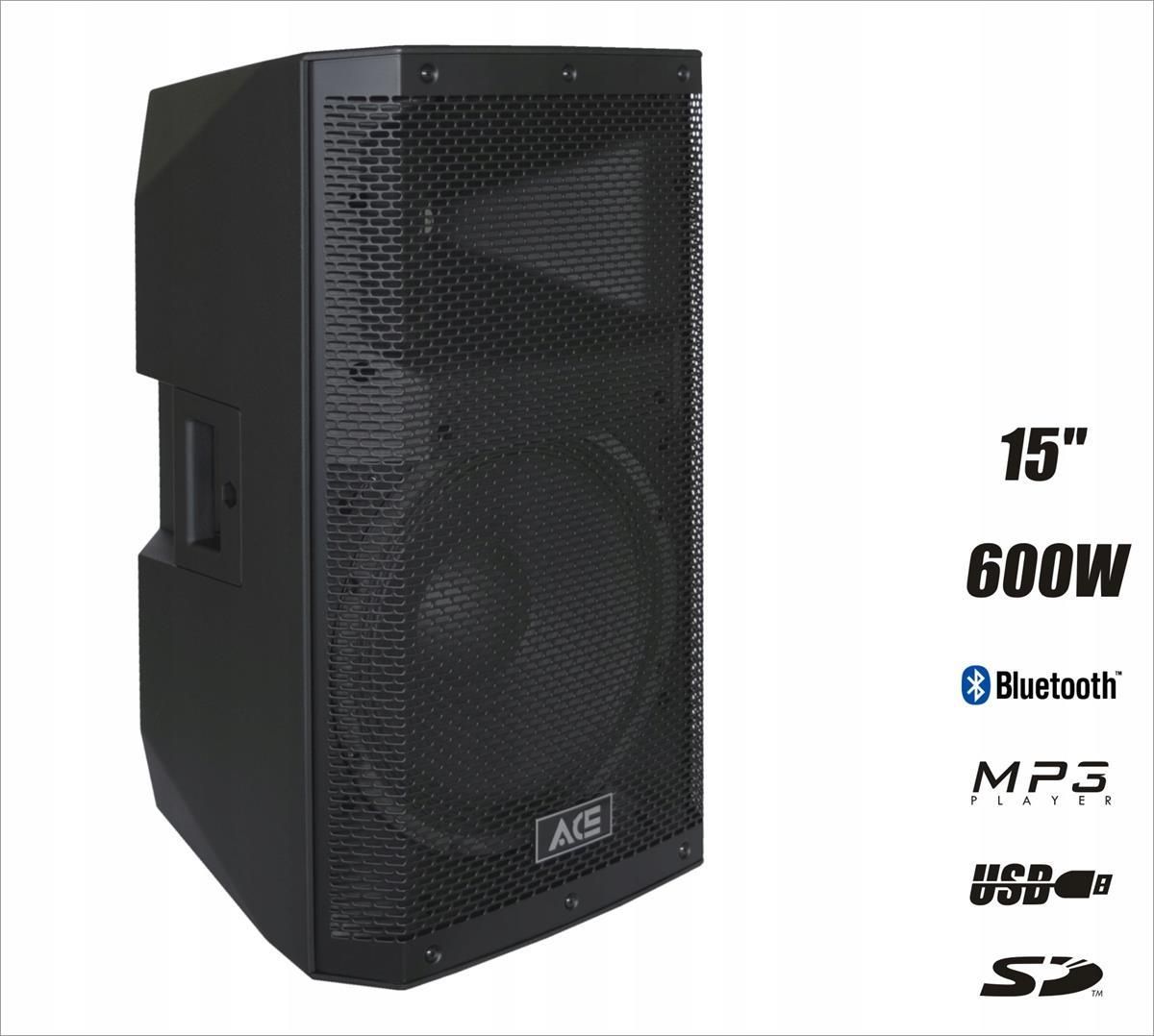 RH SOUND PBN-15C Kolumna Aktywna 600 W Aktywny zestaw 2-drożny o mocy 600W w nowoczesnej obudowie ze wzmacnianego tworzywa sztucznego. Wbudowany zdalnie sterowany pilotem IR odtwarzacz Mp3 z funkcją nagrywania w formatach MP3, WMA, wyposażony w wejście pamięci USB, łącze bezprzewodowe Bluetooth …