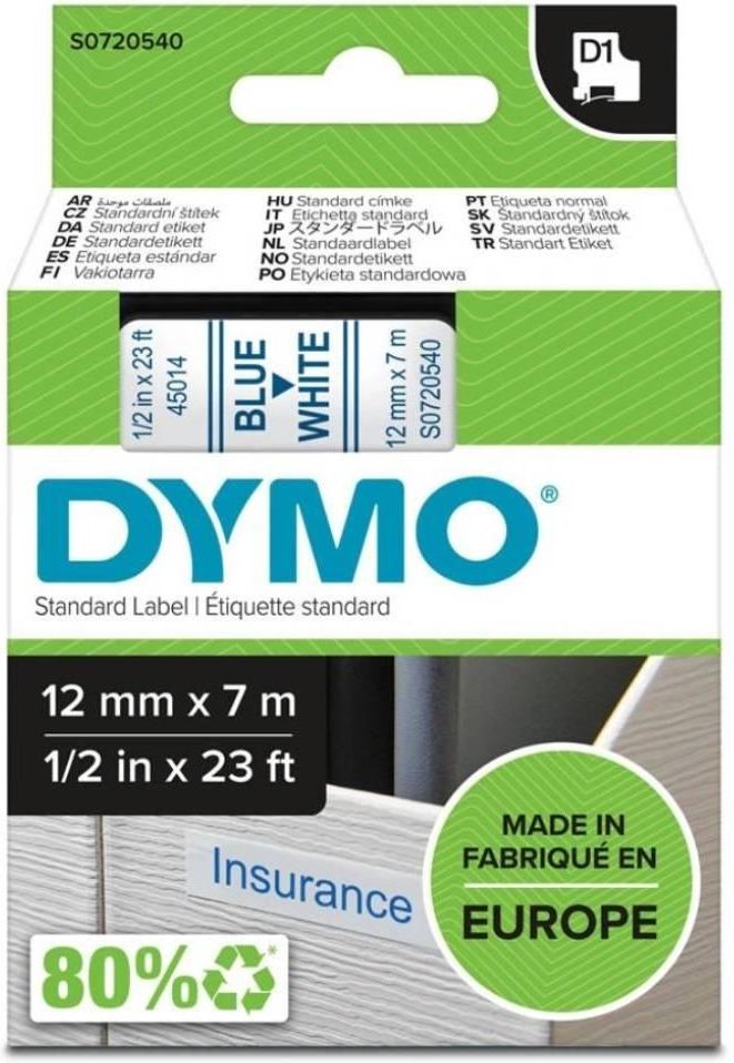 Taśma DYMO D1-45015 12 mm x 7 m / biała / czerwony nadruk / do drukarek DYMO D1 Taśmę Dymo typu D1 o wymiarze 12 mm na 7 metrów stworzono specjalnie dla twojej drukarki etykiet Dymo Label Manager, Rhino lub Label Point. Standardowe taśmy Dymo D1 wykonano ze specjalnego tworzywa sztucznego, idealnego do tzw druku sublimacyjnego. Przyklejają się praktycznie do wszystkich czystych powierzchni takich jak: plastik, papier, metal, drewno czy szkło. Posiadają łatwo usuwalną przekładkę, która umożliwia szybkie i proste naklejanie, wystarczy zgiąć w środku i odkleić. Taśmy Dymo D1 można jednak łatwo usunąć, gdy zajdzie taka potrzeba i co ważne nie pozostawia śladów po kleju. Taśmy Dymo D1 wytrzymują również pod działaniem wody, olejów lub łagodnych rozpuszczalników. Są także odporne na działanie promieni UV - nie blakną oraz nie łuszczą się. Klej na taśmach Dymo D1 nie traci swoich właściwości w temperaturze od -18 do +90 stopni Celsjusza.   Najważniejsze zalety taśmy Dymo D1 o wymiarze 12 mm  Taśmy D1 pakowane są w poręczne kasetki, łatwo włożysz je do swojej drukarki Dymo i rozpoczniejsz pracę Taśmy Dymo posiadają łatwo usuwalną przekładką zabezpieczającą, która ułatwia jej przyklejanie Do Taśm Dymo D1 nie potrzeba tonera ani tuszu - wystarczy głowica termiczna w Twojej drukarce Dymo Masz duży wybór taśm D1 w różnych kolorach Nadruk na taśmach D1 jest bardzo trwały  Dostępne w ponad 12 kolorach   Gdzie można stosować taśmy Dymo D1 12 mm  x 7 m W biurze do oznaczania segragtorów, szafek, półek, sprzętu elektronicznego W warsztacie do oznaczania narzędzi, skrzynek, urządzeń elektrycznych W skepie do oznaczania towaru W domu do oznacznia słoikow, butelek, pojemników do przechowywania    Taśmy Dymo D1 o wymiarach 12 mm  na 7 m możesz stosować w następujących drukarkach Dymo Seria drukarek Label Manager: Label Manager PnP, Label Manager 120P, Label Manager 160, Label Manager 280, 500TS, Label Manager 210D, Label Manager 260P, Label Manager 360D, Label Manager 420P, Label Manager 450D Seria drukarek Label Point: Label Point 100, Label Point 200, Label Point 250, Label Point 300, Label Point 350 Drukarka Label Writer 450 Duo Drukarki przemysłowe typu Rhino   Uniwersalne taśmy Dymo D1 12 mm x 7 m to idealny wybór dla domu lub biura.