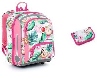 Tornister szkolny w leniwce Topgal BEBE 23001 Cechy główne anatomiczne plecy z lekkim stelażem dla dziewczyn od 115 cm wzrostu jedna komora, dwie kieszenie z przodu mnóstwo elementów odblaskowych podwójnie regulowane szelki z pasem piersiowym waży 1080 gramów końcowki szelek mają wszyte magnesy w celu eleganckiego zapięcia po regulacji migające światełko na górnej kieszeni, przywieszka leniwca do zamka membrana przeciwdeszczowa grube dno z materiału TOPDURA odporne na przetarcia stopki dystansowe na dnie, tornister nie stoi samodzielnie dwa uchwyty - do powieszenia i do przenoszenia w ręce karabińczyk na klucze wewnątrz Tornister jest zaprojektowany dla drobnej dziewczynki do 1-3 klasy, ma piękny wzór słodkich leniwców - w tym mamy leniwca z malutkim leniwcem oraz zielonych liści i różowych kwiatów. Jego praktyczne rozwiązania pozwolą dziecku swobodnie zapoznać się z zawartością wnętrza, szybko i łatwo wypakowywać książki w klasie. Tornister jest mniejszych wymiarów, niż plecaki z naszej oferty. Wysokość pleców tornistra to 37 cm. Mimo tego swobodnie mieści format A4 i książki wymagane w klasach 1-3. Plecy tornistra BEBE są miękko wypełnione, anatomicznie uformowane. Wewnątrz w specjalnej kieszeni w plecach znajduje się lekki stelaż aluminiowy, który można wyjąć. Szelki są grubo wyściełane, również anatomicznie uformowane. Tornister można dostosować do indywidualnego wzrostu dziecka dzięki podwójnej regulacji szelek. Górna regulacja służy do ustalenia odległości tornistra od pleców, a dolna - wysokości na plecach. Najpierw wyreguluj dolną część, a potem górną. Na koniec zapnij szelki pasem piersiowym i wyreguluj jego napięcie - nie może być całkowicie naprężony, bo ograniczałby wtedy ruch. Wnętrze tornistra BEBE jest podzielone przegrodami na trzy części. Przegrody są wodoodporne, więc wilgotne jabłko nie zabrudzi zeszytów. Wewnątrz znajduje się też prosty organizer na przenoszenie np. karty obiadowej, dokumentów. Butelkę na napój sugerujemy nosić w bocznej kieszeni na zewnątrz tornistra, która jest schowana za zamkiem. Na przodzie tornistra BEBE znajdują się dwie kieszenie. Górna kieszeń ma światełko, które może świecić, migać w trzech programach. Światełko aktywuje się przez kliknięcie - jest łatwe w obsłudze, dostosowane do dzieci. W środku w kieszeni znajduje się miejsce na wpisanie danych właścicielki tornistra i mała kieszonka z siateczki zamykana na zamek. Kieszeń jest wielkości piórnika PENN 23001, który należy dokupić osobno. Dolna kieszeń ma mniejszą objętość, idealna na przenoszenie kluczy, drobiazgów. Dbamy o widoczność dziecka dla kierowców - tornister ma odblaski z przodu, z boków i na szelkach. Porada Tornister BEBE ma stabilniejszą konstrukcję, niż plecak, ale nie stoi sam, może się przewrócić. Dlatego polecamy układać książki jak najbliżej pleców, aby nie obciążać przodu tornistra.