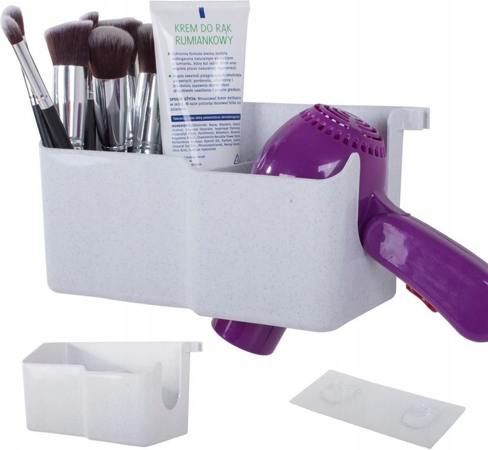 Uchwyt naścienny do suszarki do włosów pozwoli zaoszczędzić miejsce w łazience. Wyposażony jest w uchwyt na kabel, 3 dodatkowe przegródki na różne kosmetyki albo akcesoria i 2 dodatkowe małe wieszaki np. na gumki do włosów lub myjkę. Dzięki dużemu otworowi w dnie uchwytu bez problemu pasuje on do Uchwyt naścienny do suszarki do włosów pozwoli zaoszczędzić miejsce w łazience. Wyposażony jest w uchwyt na kabel, 3 dodatkowe przegródki na różne kosmetyki albo akcesoria i 2 dodatkowe małe wieszaki np. na gumki do włosów lub myjkę. Dzięki dużemu otworowi w dnie uchwytu bez problemu pasuje on do większości suszarek. Estetyczny, elegancki wygląd pasujący do każdego wnętrza oraz lekka i wytrzymała konstrukcja z tworzywa sztucznego, sprawi że urządzenie będzie służyć przez długi czas. Uchwyt jest bardzo łatwy w montażu, wystarczy odtłuścić powierzchnię na której będzie przyklejone mocowanie, następnie przykleić za pomocą przylepca, który jest w zestawie. Zaleca się mocować na powierzchniach typu glazura, gres, itp. SPECYFIKACJA TECHNICZNA: ✅ Kod produktu: 24125 ✅ Materiał wykonania: tworzywo sztuczne ✅ Pasuje do większości suszarek ✅ Prosty montaż ✅ Mocowanie na ścianę ✅ 2 Małe wieszaki w zestawie ✅ Kolor: Jasno szary WYMIARY: ✅ Średnica otworu: 8cm ✅ Wysokość: 11cm ✅ Długość: 21cm ✅ Głębokość: 11,5cm ZESTAW ZAWIERA: ☑️ Fabrycznie nowy wieszak na suszarkę do włosów ☑️ 2 Małe haczyki ☑️ Samoprzylepna naklejka montażowa ☑️ Oryginalne opakowanie