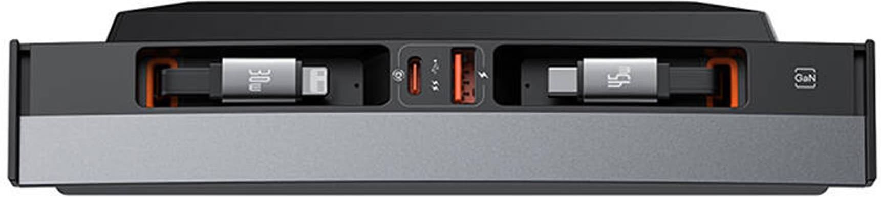 Hub Baseus T-Space z kablem USB-C do Lightning dla Tesla (czarny) Producent: Baseus Kod producenta: B00051300111-01 Model: TS010 Kolor: czarny Materiał: ABS, PC, stop aluminium Napięcie wejściowe (USB-C1/2): 9V/3A Napięcie wyjściowe (kabel 1): 5V/3A, 9V/3A, 12V/2.5A, 15V/2A, 20V/1.5A, 30W max. Napięcie wyjściowe (kabel 2): 5V/3A, 9V/3A, 12V/3A, 15V/3A, 20V/2.25A, 45W max. USB-C: 5V/3A, 9V/3A, 12V/2.5A, 15V/2A, 20V/1.5A, 30W max. PPS: 3.3V-11V, 3.3A USB-A: 5V/2.4A Kabel 1 + kabel 2: 30 W + 18 W kabel 1 + kabel 2 + USB-C: 18 W + 18 W + 8 W kabel 1 + kabel 2 + USB-C + USB-A: 18 W + 8 W + 8 W + 12 W Waga: ok. 318 g Wymiary: 196 × 100 × 32 mm Hub Baseus T-Space z kablem USB-C do Lightning dla Tesla (czarny) Hub Baseus T-Space został specjalnie zaprojektowany dla Tesli. Oferuje wbudowane porty USB-C i USB-A oraz 2 zwijane kable USB-C, dzięki czemu możesz ładować 4 urządzenia jednocześnie. Dzięki wykorzystaniu mocy 45 W nie musisz długo czekać, aż Twój smartfon będzie gotowy do dalszej pracy. Co więcej, Baseus Power Split 2.0 automatycznie dostosowuje moc ładowania do podłączonego sprzętu – możesz mieć pewność, że są bezpieczne. Szybkie, bezpieczne ładowanie Hub Baseus to pierwsze tego typu urządzenie przeznaczone do Tesli, które wykorzystuje technologię ładowania GaN. W rezultacie ładowanie jest szybkie i nie powoduje przegrzania sprzętu. Moc na poziomie 45 W pozwala w krótkim czasie odnowić energię smartfona, tabletu lub laptopa. Produkt wspiera również różne protokoły szybkiego ładowania, w tym PD3.0, FCP, SCP, QC3.0 i AFC. Zapewnia też ochronę urządzeń przed prądem przetężeniowym, zwarciem, przegrzaniem itp. Zaprojektowane dla Tesli Baseus T-Space jest przeznaczony do Tesli i doskonale wpasowuje się w jej wnętrze. Posiada specjalną osłonę chroniącą porty i kable przed kurzem lub przypadkowo rozlanym napojem. Z kolei silikonowe wykończenie chroni elementy samochodu przed zarysowaniem. Wygodne rozwiązania Wyróżnia się też 2 zwijanymi kablami USB-C o długościach po 0,8 m, dzięki czemu również pasażerowie siedzący z tyłu mogą z nich korzystać – ich magnetyczne złącza ułatwiają przechowywanie. Ponadto porty USB-A i USB-C pozwalają podłączyć dodatkowe urządzenia, na przykład słuchawki TWS czy kontroler do gier. Hub umożliwia także transfer danych (dostępne w przypadku modeli 3 oraz Y).