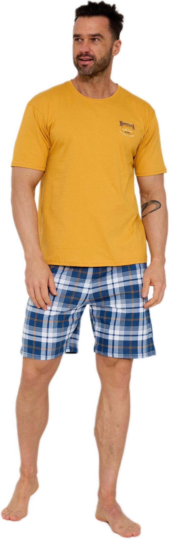Piżama męska KR 326/213 MONTANA 2 marki Cornette to klasyczny, bawełniany komplet nocny zapewniający wygodę i swobodę podczas snu oraz domowego wypoczynku. Wykonana w 100% z naturalnej bawełny, jest miękka, przewiewna i przyjemna dla skóry. Koszulka z krótkim rękawem ma jednolity, stonowany kolor oraz półokrągły dekolt, który zapewnia komfort noszenia. Na wysokości piersi znajduje się niewielki, subtelny nadruk, dodający całości nowoczesnego charakteru bez przesadnej ozdobności. Krótkie spodenki w klasyczną kratkę doskonale komponują się z gładką górą kompletu. Elastyczny pas obszyty bawełną gwarantuje wygodne dopasowanie do sylwetki i zapobiega uciskowi, zwiększając komfort użytkowania. Model MONTANA 2 to idealna propozycja dla mężczyzn ceniących ponadczasowy styl, naturalne materiały i wygodę na co dzień. Skład: 100% bawełna.