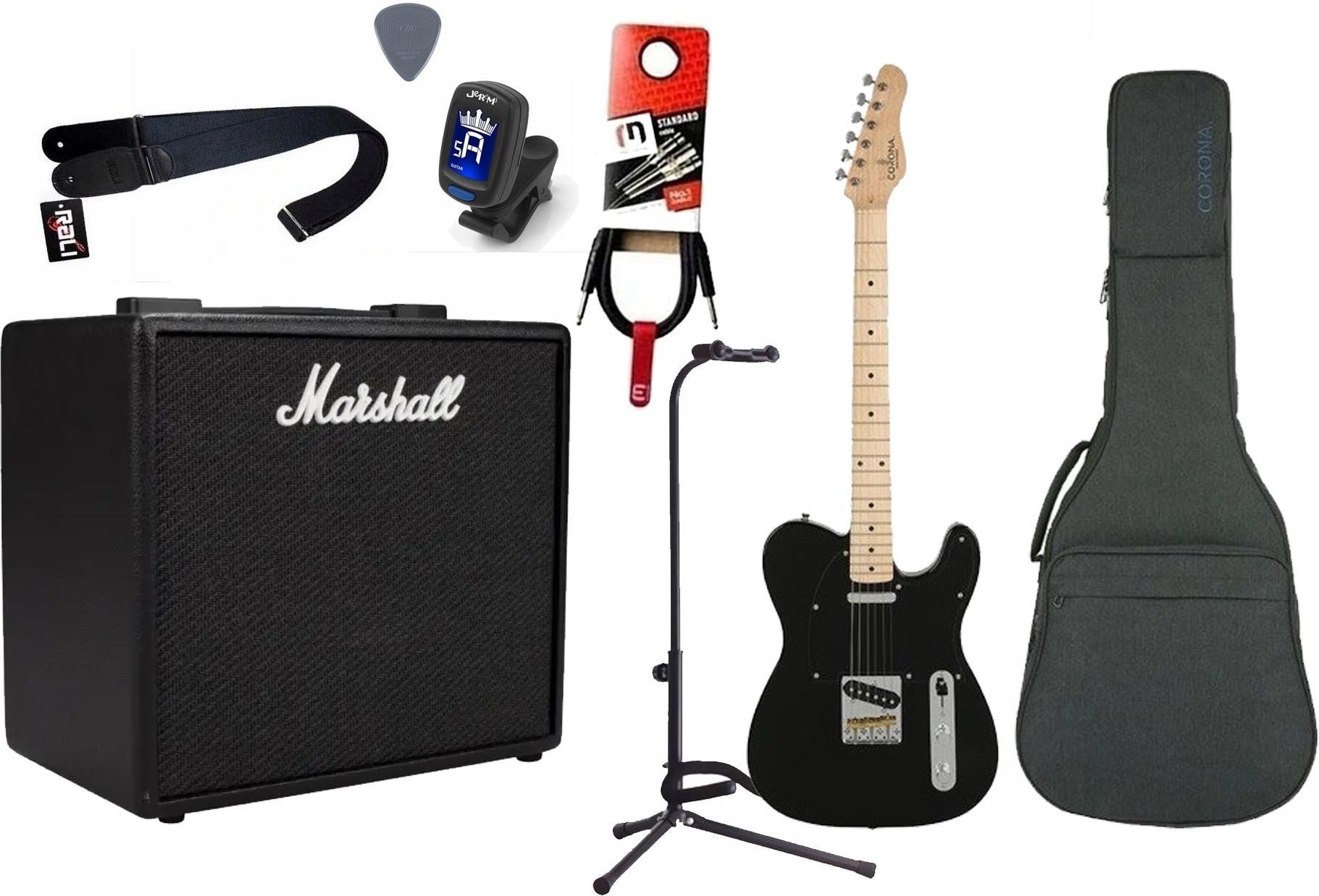 GITARA ELEKTRYCZNA + WZMACNIACZ 25W KABEL ZESTAW Kompletny zestaw gitarowy, w zestawie: 1 x Gitara Elektryczna (opis poniżej), 1x Wzmacniacz gitarowy Marshall Code 25W, 1x Pasek gitarowy Rali, 1x Tuner chromatyczny, 1x kabel gitarowy 3 metrowy, 1x statyw gitarowym, 1x kostka gitarowa Janicek CORONA …