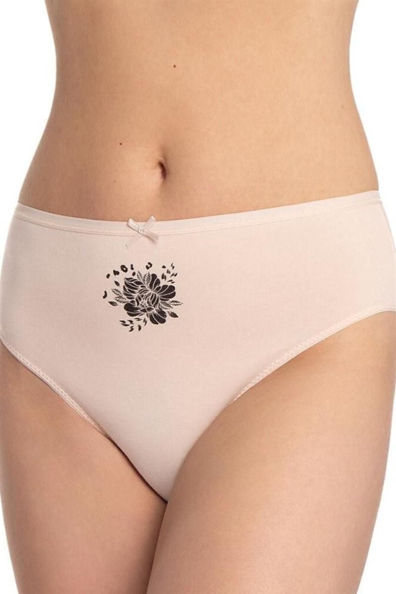 Bawełniane figi damskie klasyczny krój, bikini w pasie płaska gumka z kokardką biodra lekko zabudowane pakowane w foliowy woreczek po trzy sztuki w kolorze beżowym, czarnym i czarno-beżowym Skład: 95% bawełna, 5% elastan