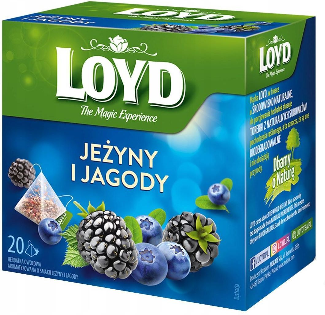 Herbatka owocowa LOYD Jagoda i Jeżyna 20 torebek Jagody i jeżyny to zdobycze letnich spacerów - kto nie zna i nie lubi ich smaku? Połączone w odpowiednich proporcjach komponują się wyśmienicie. Spróbuj herbatki owocowej Loyd Jagoda i Jeżyna, która przynosi orzeźwienie w letnie dni, ale jest też doskonałym wspomnieniem wakacyjnych przygód w jesienne wieczory. Sprawdź, kiedy smakują najlepiej! [desc_feature 50 48 46] [desc_attribute] Starannie wyselekcjonowane W tych herbatkach znajdziesz niespotykane połączenia smaków i aromatycznych owoców, przypraw, ziół... Spróbuj niecodziennych kompozycji, które LOYD stworzył z myślą o prawdziwych smakoszach. To propozycja doskonała zarówno na ciepłe jak i zimowe dni. Każda pojedyncza herbatka pakowana jest w piramidowe, biodegradowalne torebki, które dzięki zastosowaniu innowacyjnego, jedwabistego materiału, jeszcze lepiej uwalniają zawarty w niej bukiet smaków. W linii herbatek owocowych LOYD odnajdziesz szeroki wachlarz kompozycji herbacianych, które powstały na bazie owoców sadu, lasu, a także owoców egzotycznych. Odpowiednio dobrane proporcje składników tworzą herbatki, które urzekają smakiem nie tylko wielbicieli klasyki, ale także amatorów niekonwencjonalnych połączeń smakowych. Herbatki owocowe LOYD w piramidowych torebkach zostały stworzone dla miłośników prawdziwie owocowych smaków, a przygotowany z nich napar uzyskuje głęboką barwę, wspaniały aromat i niezwykły smak. Przekonaj się czy wolisz je pić jako gorący napar czy orzeźwiający napój sporządzony np. z dodatkiem lodu. Sposób przygotowania Włożyć torebkę herbaty do filiżanki. Zalać 200 ml wrzącej wody. Parzyć 5 minut.