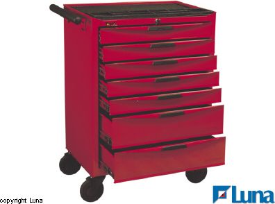 Charakterystyka produktu: Z blachy stalowej lakierowanej na czerwono. Z dwoma kółkami stałymi i dwoma osadzonymi obrotowo z hamulcem. Wyposażony w 7 łożyskowanych kulkowo, zamykanych szuflad. Każda szuflada wyłożona mikrogumą. Mocna rękojeść chwytowa do ciągnięcia wózka. Blat roboczy z wykładziną z tworzywa ABS. Dane techniczne: Wym. szuflady (5 szt.): 575x380x75 mm Wym. szuflady (2 szt.): 575x380x150 mm Max. obciąż. szuflady (rozkład równomierny): 25 kg Wymiary wózka: 670x460x950 mm średnica kółek: 125 mm Masa: 64 kg
