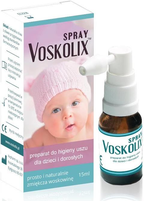 Preparat na bazie oliwy z oliwek przeznaczony jest dla dzieci i dorosłych do stosowania zewnętrznego. Ułatwia usuwanie twardych korków woskowinowych, wspomaga naturalny proces samooczyszczania ucha z woskowiny oraz zapobiega powstawaniu korków woskowinowych, a w sytuacjach wymagających płukania uszu przez lekarza ułatwia usunięcie woskowiny. Oliwa z oliwek ma właściwości łagodzące podrażnienia i pielęgnuje w naturalny sposób wysuszoną skórę przewodu słuchowego. Woskowina Wytwarzana przez znajdujące się w przewodzie słuchowym gruczoły, bardzo tłusta substancja o żółtawobrunatnym zabarwieniu, powleka cienką warstwą skórę stanowiąc skuteczną ochronę przed nadmiernym rozwojem bakterii lub jej wysuszeniem. W normalnych warunkach jest naturalnie usuwana na zewnątrz przewodu słuchowego. Jakiekolwiek zaburzenia procesu transportu woskowiny na zewnątrz powodują nadmierne jej gromadzenie oraz powstawanie trudnych do usunięcia czopów woszczynowych. Objawem tego mogą być różne dolegliwości, z których najczęstszą jest pogorszenie słuchu (niedosłuch przewodzeniowy). Wskazania VOSKOLIX to skuteczny i bezpieczny preparat wspomagający zmiękczanie i naturalne usuwanie woskowiny usznej. VOSKOLIX jest przeznaczony dla dzieci i dorosłych. VOSKOLIX zmniejsza konieczność zabiegowego płukania uszu przez lekarza, a w sytuacjach tego wymagających ułatwia usunięcie woskowiny. VOSKOLIX jest szczególnie polecany w stanach nadmiernej produkcji woskowiny usznej, bądź u osób z tendencją do wysychania woskowiny usznej i tworzenia się suchych korków woskowinowych. VOSKOLIX wskazany jest do stosowania u osób uprawiającym sporty wodne (pływanie, nurkowanie), ponieważ tworzy naturalną barierę ochronną. Oliwa z oliwek ma właściwości łagodzące podrażnienia i pielęgnuje w naturalny sposób wysuszoną skórę przewodu słuchowego. VOSKOLIX jest łatwy i wygodny w stosowaniu. Może być aplikowany w pozycji siedzącej, leżącej lub stojącej. Sposób użycia Przed pierwszym użyciem preparatu należy wstrząsnąć buteleczką oraz nacisnąć aplikator od 3 do 4 razy do pojawienia się preparatu. Stosować 1-2 razy w tygodniu w celu zapobiegania gromadzeniu się woskowiny. W przypadku konieczności usuwania woskowiny przez lekarza zaaplikować od 1 do 2 dawek preparatu, dwa razy dziennie przez okres 4-5 dni przed wizytą u lekarza. Składniki Naturalna oliwa z oliwek przygotowana według standardów farmaceutycznych. Przeciwwskazania Nie stosować w przypadku uczulenia na oliwę z oliwek. Nie stosować przy wyciekach z ucha, podrażnieniu, wysypce w uchu, zawrotach głowy, urazie lub perforacji błony bębenkowej, drenażu błony bębenkowej. W przypadku powyższych stanów, przed użyciem preparatu, zasięgnąć porady lekarza. Przechowywanie Przechowywać w sposób niedostępny dla dzieci. Przechowywać w temperaturze od 15 do 30 stopni C. Ostrzeżenia Nie stosować u dzieci poniżej 1. roku życia bez konsultacji z lekarzem. PKWIU 32.50.50.0 Rodzaj Wyrób medyczny leczniczy EAN 5901968037075 BLOZ_07 9072973