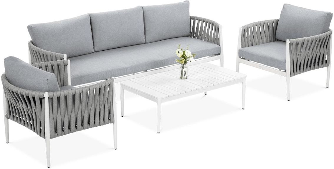 Zestaw mebli do ogrodu MONZA CAFFE White - FURRORE - OpisZestaw ogrodowy Furrore MONZA CAFFE White to elegancki i wyrafinowany mebel, który idealnie wpasuje się w każdą nowoczesną aranżację luksusowego tarasu, oranżerii czy ogrodu. Składa się z wyjątkowej 3-osobowej sofy, dwóch wygodnych krzeseł oraz minimalistycznego stolika kawowego o długości 120 cm. Mebel wyróżnia się nowoczesnym designem, który podkreśla jego minimalistyczny kolor w nasyconym odcieniu szarości. Konstrukcja mebla została wykonana z lekkiego i wytrzymałego aluminium malowanego proszkowo, co zapewnia mu dużą wytrzymałość i odporność na warunki atmosferyczne i promieniowanie UV. Jednym z najważniejszych elementów, które nadają meblom z serii MONZA wyjątkowy charakter, są grube nylonowe sznurki, zastosowane na oparciach sofy i krzeseł. To unikalne rozwiązanie nadaje meblom jedyny w swoim rodzaju nowoczesny i futurystyczny design. Mebel prezentuje się bardzo okazale, a szyku dodają mu miękkie i niezwykle wygodne poduszki z szarymi poszewkami.Zestaw MONZA CAFFE White to meble, które doskonale uzupełni strefę relaksu, zwłaszcza jeśli dużo czasu spędzasz na świeżym powietrzu, przyjmujesz gości lub organizujesz spotkania w ogrodzie. Wysoka trwałość i wytrzymałość sprawiają, że meble są prawdziwą ozdobą ogrodu. Mebel jest łatwy w utrzymaniu czystości – można go myć wodą, a poszewki poduszek można zdjąć i wyprać w pralce. Zestaw można modyfikować w zależności od potrzeb. Można korzystać z sofy osobno lub zaaranżować mały kącik z krzesłami i stolikiem kawowym na popołudniowy odpoczynek. Lekkość mebla pozwala z łatwością zaaranżować go zgodnie z aktualnymi potrzebami. Stonowana kolorystyka pozwala na różnorodne aranżacje – zarówno w spokojnej stylistyce, jak i bardziej wyrazistej, poprzez dodanie kontrastowych barw w postaci dywanu, poduszek czy kwiatów.Jeśli szukasz kompleksowej aranżacji nowoczesnego tarasu w niebanalnym stylu, to zestaw ogrodowy MONZA CAFFE będzie doskonałym uzupełnieniem lub uzupełnieniem innych mebli z serii MONZA. Zachwyci każdego, kto ceni sobie piękny design i ponadprzeciętną wygodę. Cechy produktu meble przeznaczone są zarówno do użytku zewnętrznego jak i wewnętrznego konstrukcja wykonana jest z aluminium malowanego proszkowo, co zapewnia stabilność i lekkość konstrukcji oraz całkowitą odporność na rdzę gruby sznur nylonowy, nadaje temu narożnikowi jedynego w swoim rodzaju nowoczesnego i futurystycznego designu poduszki zapewniają maksimum wygody i posiadają zdejmowane poszewki, nie ma więc problemu z ich upraniem w razie ubrudzenia całość jest bardzo łatwa do utrzymania w czystości i doskonale sprawdza się w codziennym użytkowaniu dzięki użyciu materiałów najwyższej jakości nasz zestaw oznacza się trwałością, odpornością na warunki atmosferyczne i promieniowanie UVWymiary Sofa: szeroka - 195cm, głębokość - 83cm, wysokość - 70cm Fotel: szerokość - 93cm, głębokość - 83cm, wysokość - 70cm Stolik: długość - 120cm, szerokość - 70cm, wysokość - 37cm