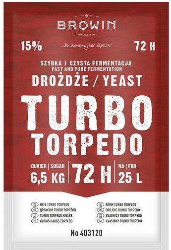 Drożdże gorzelnicze Turbo Torpedo 72h to idealna mieszanka drożdży, pożywek i witamin do szybkiej i czystej fermentacji. Pozwalają uzyskać do 15% alkoholu w 72 godziny! Polecane do nastawów cukrowych i owocowych, a także zacierów z kukurydzy, jęczmienia, żyta, pszenicy, ziemniaków i melasy.Istotne cechy:#8226; gramatura 120 g#8226; na 25L nastawu#8226; na 6,5 kg cukru#8226; alkohol: 15%#8226; do nastawów cukrowych i owocowych; zacierów z kukurydzy, jęczmienia, żyta, pszenicy, ziemniaków i melasySposób użycia:W naczyniu rozpuścić 6,5 kg cukru w 8 litrach przegotowanej, gorącej wody, całość dokładnie wymieszać. Po wystudzeniu do 30deg;C, płyn przelać do balonu bądź pojemnika fermentacyjnego, uzupełnić wodą o temp. pokojowej do 25 litrów. Dodać zawartość saszetki i dokładnie wymieszać. Po zamontowaniu rurki fermentacyjnej całość pozostawić do fermentacji w temp. 22-29deg;C na 3dni. Składniki: : drożdże, pożywka mineralna, witamina B1.Uwaga: opakowanie wykorzystaj w całości do jednego nastawu.Wymiary opakowania:masa netto: 120 gwysokość: 17,9 cmszerokość: ok 1,0 cmdługość: 12 cm