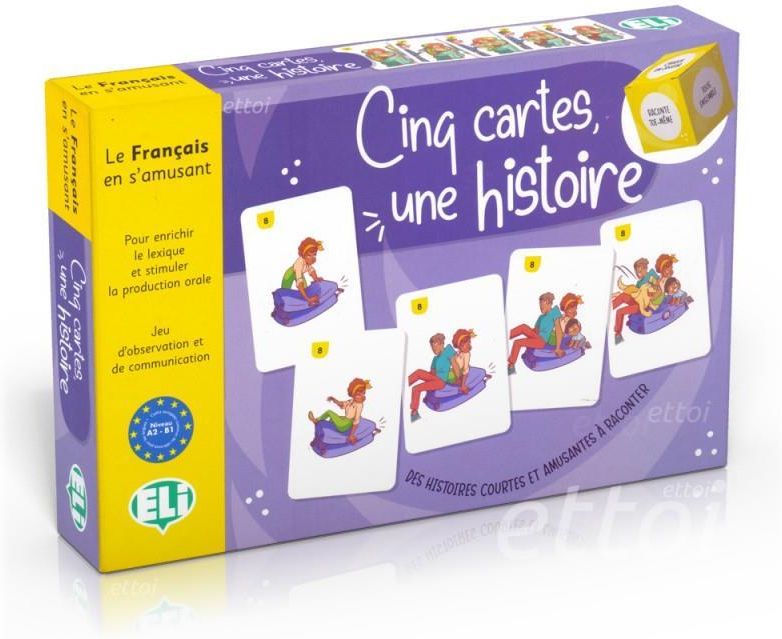 Cinq cartes, une histoire: Opowiedz, co się wydarzyło! Gra w opowiadanie historii po francusku. Zabawne historyjki obrazkowe, które w naturalny sposób skłonią do mówienia. • 40 śmiesznych scenek z życia codziennego zaprezentowanych w komiksowej formie! • Metoda storytellingu (narration), która rozwiąże język! • Ćwicz umiejętności opowiadania o wydarzeniach i rozwijaj kompetencje narracyjne. • Kluczowe cechy gry: - charakter / wiodący typ gry: karciana, - poziom trudności: podstawowy i średnio zaawansowany (A2-B1), - ilość graczy: od 2 do kilkunastu, - przedział wiekowy: od lat 7 wzwyż, - ilość proponowanych wariantów rozgrywki: 11. • Podstawowa zasada rozgrywki: Do dyspozycji graczy jest 40 historyjek, z których każda składa się z 5 obrazków umieszczonych na 5 kartach. Wszystkie karty należy potasować, rozdać zawodnikom po 5 kart, a pozostałe karty ułożyć na środku stołu. Celem gry jest skompletowanie całej pięcioobrazkowej historyjki. W tym celu gracze kolejno ciągną karty dobierając te potrzebne i odrzucając niepasujące karty. Skomponowana historyjka musi następnie zostać opowiedziana przez zawodnika lub - w zależności od wylosowanego za pomocą kostki polecenia - przez inną osobę. Skompletowane oraz poprawnie opowiedziane historie premiowane są punktami. • Tematyka i cele językowe:, - wzbogacenie znajomości słownictwa, - ćwiczenie rozumienia ze słuchu, - ćwiczenie mówienia (production orale), - ćwiczenie umiejętności komunikacyjnych. • Gra znajduje zastosowanie: - w trakcie zajęć w szkole: szkoła podstawowa w klasach od 5 do 8, szkoła ponadpodstawowa (liceum, technikum) w klasach od 1 do 4 - w szkołach językowych realizujących kursy języka francuskiego na poziomach A2 i B1, - w warunkach domowych (zabawy z przyjaciółmi i rodziną, gry towarzyskie lub prywatne lekcje języka francuskiego). • Zestaw zawiera: - 2 talie po 100 kart, - składaną kostkę do gry, - instrukcję w języku francuskim i polskim.