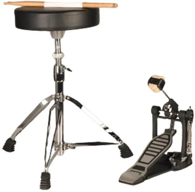 Zestaw akcesoriów perkusyjnych A firmy EFNOTE. W skład wchodzą: Regulowany stołek Stopa do basu Pałki perkusyjne
