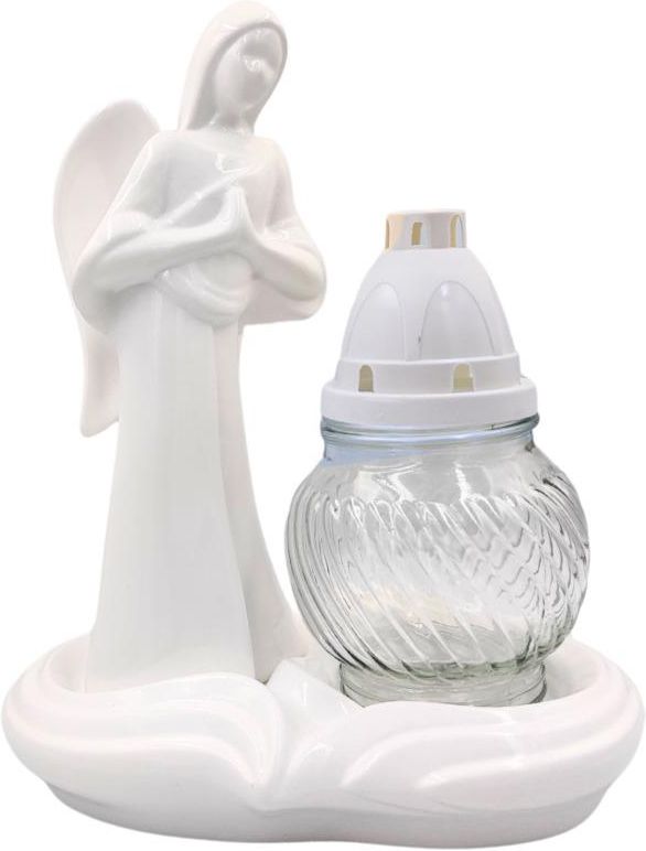 Figurka Anioł Ceramiczny Biały + Znicz Szklany 28 cm Elegancki wygląd dodający klasy w białym kolorze z białą powierzchnią, która pięknie odbija światło dodając blasku. Idealne połączenie elegancji i klasyki. Znicz prezentujący się bardzo efektownie. W zniczu można używać standardowych wkładów/ wkładów LED Do tego lampionu zalecamy wkłady o maksymalnych wymiarach: 10 cm x 6 cm Wymiary: Wysokość: 28 cm Szerokość: 21 cm Dodatkowe cechy: Trwałość: Odporny na warunki atmosferyczne (deszcz, śnieg) Czas palenia: Znicz jest niski, możesz dobrać wkłady o krótkim czasie palenia Estetyka i wzornictwo: Oryginalny model, delikatnie zdobiony Kolor: Biała czapeczka i dół Stabilność: Stabilna podstawa zapobiega przypadkowemu wylaniu się wkładu Obsługa: Możesz szybko wymienić wkład bez brudzenia rąk Dlaczego warto wybrać ten znicz? Jest to idealny wybór dla Ciebie, jeśli stawiasz na oryginalność Ma oryginalny wygląd i brak zbędnych ozdób Subtelna forma pozwala wyrazić Twoje uczucia w sposób elegancki, a jednocześnie w sposób bardziej okazały Jest uniwersalny, bez względu na to czy wybierasz go na Wszystkich Świętych, czy na co dzień, zawsze będzie wyglądał elegancko
