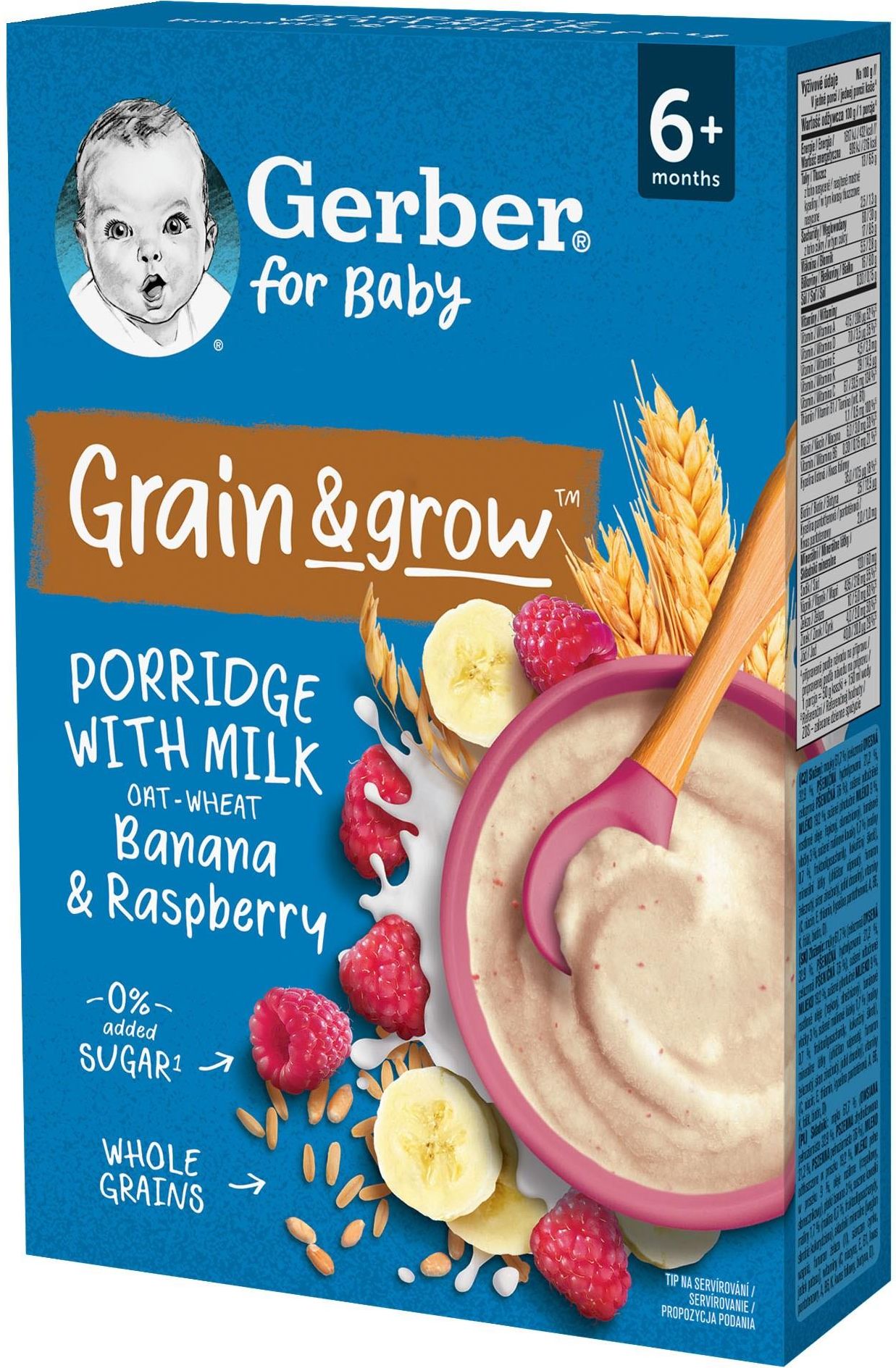 Kaszka owsiano-pszenna mleczna banan malina Pełnowartościowy posiłek dla Twojego dziecka po 6. miesiącu życia. Kaszka stanowi harmonijne połączenie wysokiej jakości zbóż (w tym pełnoziarnistych) oraz m.in mleka i owoców – banana i maliny. Te wartościowe składniki sprawiają, że jest to dobry pomysł na śniadanie czy kolację dla maluszka. Nasza kaszka Grain & grow zawiera cenne witaminy i składniki mineralne, które wspierają prawidłowy rozwój dziecka. Odkryj zalety produktu Kaszki Gerber Grain & grow zawierają nie tylko to, co niezbędne, ale znacznie więcej! To dobro wysokiej jakości zbóż, w tym pełnoziarnistych, dopasowanych do potrzeb żywieniowych Twojego Maluszka. Nie ma w nich dodatku cukru (zawierają naturalnie występujące cukry) i dla dobra najmłodszych zawierają ważne witaminy i składniki mineralne. Zawarte w kaszce zboża dostarczają do diety dziecka węglowodanów, a żelazo wspiera rozwój funkcji poznawczych. Cynk przyczynia się do prawidłowego rozwoju, a wapń i witamina D są ważne dla zdrowych kości. Dodatkowo, cynk i witamina C wspierają odporność.  Kaszka owsiano-pszenna Banan Malina z linii Gerber Grain & grow to nie tylko bogactwo wartościowych zbóż. To także dodatek owoców, które świetnie komponują się smakowo. Całość tworzy doskonałe połączenie, odpowiednie dla dzieci po 6. miesiącu. Tabela wartości odżywczych i składniki produktu Składniki mąka 61,7% (owsiana pełnoziarnista 32,9%, pszenna zhydrolizowana 21,2%, pszenna pełnoziarnista 7,6%), mleko odtłuszczone w proszku 19,2%, mleko pełne w proszku 9%, oleje roślinne (rzepakowy, słonecznikowy), płatki banana 3%, suszone kawałki maliny 1,7%, (malina 0,7%, fruktooligosacharydy, skrobia kukurydziana), składniki mineralne [węglan wapnia, fumaran żelaza (II), siarczan cynku, jodek potasu], witaminy (C, niacyna, E, B1, kwas pantotenowy, A, B6, kwas foliowy, biotyna, D). Gramatura Masa netto: 200 g Segregując odpady, dbasz o lepszą przyszłość Twojego dziecka. Kartonik wyrzuć do kosza oznaczonego kolorem niebieskim, natomiast torebkę do kosza oznaczonego kolorem żółtym.  Sposób przygotowania Zanim przystąpisz do przyrządzania posiłku, umyj dokładnie ręce i upewnij się, czy naczynia, których będziesz używać, są czyste.  Zagotuj wodę i odmierz 150 ml, wlej do miseczki i ostudź do ok. 40°C.  Dodaj 50 g (około 6-7 łyżek stołowych) kaszki. Używaj czystej i suchej łyżki.  Mieszaj do uzyskania jednolitej konsystencji.  Nakarm dziecko, używając czystej łyżeczki.  Przestrzegaj instrukcji właściwego przygotowania. Opakowanie zawiera około 4 porcji. Wielkość porcji powinna być dostosowana do wieku dziecka.  Sposób podawania Nie przechowuj resztek posiłku. Nieprawidłowe przygotowanie i przechowywanie może zaszkodzić Twojemu dziecku.  Po każdym użyciu zamknij szczelnie torebkę i przechowuj w suchym i chłodnym miejscu. Po otwarciu zawartość torebki zużyj w ciągu 3 tygodni. Najlepiej spożyć przed końcem: patrz data na spodzie opakowania.  Poznaj wszystkie produkty z linii Gerber Grain & Grow Pamiętaj, że dla zdrowia dziecka ważna jest urozmaicona i zbilansowana dieta oraz zdrowy tryb życia. Komponując jadłospis, kieruj się zasadami żywienia niemowląt i małych dzieci i zaleceniami lekarza. Jeśli Twoje dziecko poznało już naszą Kaszkę owsiano-pszenną mleczną Banan Malina, możesz zapoznać maluszka także z innymi kaszkami z linii Grain & grow!
