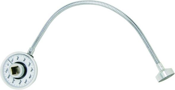 KĄTOMIERZ KLUCZA DYNAMOMETRYCZNEGO 1/2' Z MAGNESEM JONNESWAY AG010118A Kątomierz klucza dynamometrycznego do dokręcenia m.in. głowic o określonym kącie ( końcowego dokręcania śrub i nakrętek ) z określonym naciągiem poprzez pomiar kąta obrotu. Współpracuje z kluczem 1/2 , łatwy i prosty w obsłudze. Skala kąta co 2 stopnie , - obudowana osłoną z tworzywa. Pokrętło wykonane ze stali chromo- wanadowej. Elastyczne ramię o długości 330mm zakończone magnetyczną końcówką. Skala 0 - 360 stopni.