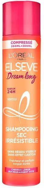 Suchy szampon do długich włosów, które szybko się schną: długotrwały świeżość i zapach bez widocznych pozostałości i bez efektu tektury! Suchy, nieodparty szampon dream long pochłania sebum, jednocześnie dodając włosom elastyczność i lekkość od nasady dla długotrwałego uczucia świeżości wchłania sebum i odświeża włosy bez pozostawiania widocznych pozostałości przynosi objętość u nasady delikatnie perfumuje włosy podczas 24-godzinnego testu sensorycznego Przed nałożeniem 15 cm od włosów u nasady potrząśnij skórę głowy i szczotkuj. wskazówka: szczotkuj włosy w dół, aby uzyskać jeszcze większą objętość i lekkość!