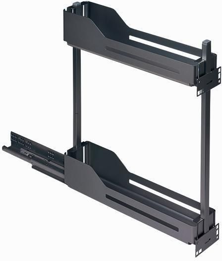 Wyciąg podblatowy do szafki wąskiej o szerokości frontu 150 mm. Półki wykonane są w linii Libell w kolorze antracyt. Półki zostały doposażone w matę antypoślizgową, która zapobiega przesuwaniu się produktów podczas wysuwania i wsuwania, dodatkowo zabezpiecza dno półki i ułatwia utrzymanie czystości. Rama mocowana jest pod półką co umożliwia łatwy dostęp z obu stron wyciągu. Prowadnica mocowana jest zawsze z prawej strony.