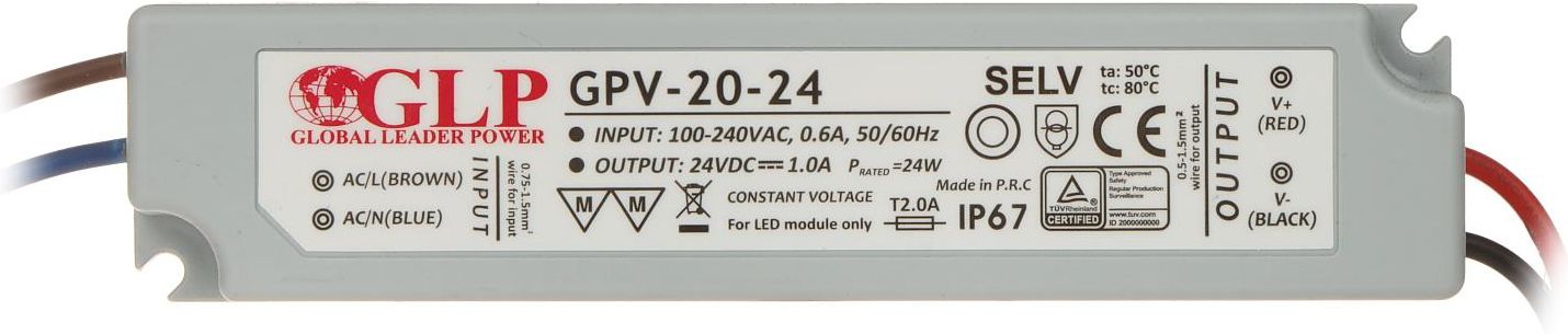 ZASILACZ GLP 20W 1A 24V IP67 GPV-20-24 CECHY Zasilacz stałonapięciowy Uniwersalny zakres wartości napięcia wejściowego Zabezpieczenia: Zwarciowe / Nadprądowe / Nadnapięciowe / Termiczne Chłodzenie swobodnym obiegiem powietrza II klasa ochronności Stopień ochrony IP67 SPECYFIKACJA ELEKTRYCZNA …
