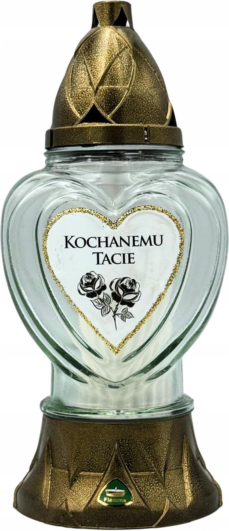 Znicz dla Taty Kochanemu TACIE Serce Lampion Ozdobny 27 cm + Wkład Lampion na Dzień Ojca Kolor biało-złoty Nowoczesny lampion, z naklejką. Produkt wiodącego producenta zniczy artystycznych. Produkt trwały, dobrze spasowany, wykonany ze szkła oraz wysokiej jakości tworzywa sztucznego (podstawa i daszek). Cechy produktu Wysokość całego lampionu to 27 cm Szerokość w najszerszym miejscu to 12 cm Miejsce na wkład ma wymiary 14 cm x 6 cm* Podstawa i daszek w kolorze złotym W zestawie wkład parafinowy *Wymiary maksymalne, zalecamy używanie niższych wkładów dla lepszego efektu oraz utrzymania odpowiedniej odległości kapturka od źródła ciepła. Lampion przystosowany do użytku wkładów: parafinowych olejowych na baterie solarnych Zalecamy używanie wkładów FLAMMA dla utrzymania znicza w najlepszej kondycji. Proponowany przez nas rozmiar do tego znicza to "FLAMMA 3" - wkład 3-dniowy. Poniżej przykład aranżacji tego modelu znicza, wkład nie stanowi części zestawu.