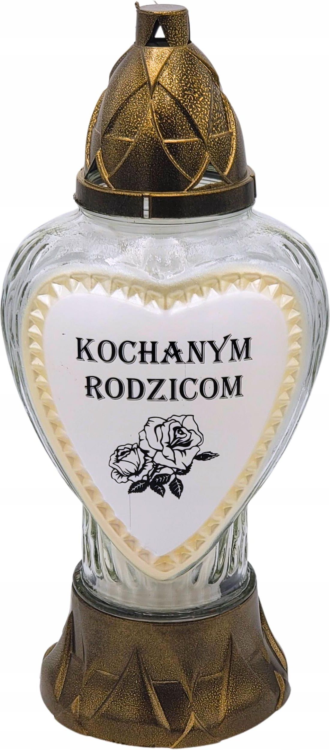 Znicz na Grób z Dedykacją dla Rodziców Złote Serce Lampion Ozdobny 30+Wkład Lampion z dedykacją Kochanym Rodzicom Kolor biało-złoty Nowoczesny lampion, ręcznie malowany. Produkt wiodącego producenta zniczy artystycznych. Produkt trwały, dobrze spasowany, wykonany ze szkła oraz wysokiej jakości …