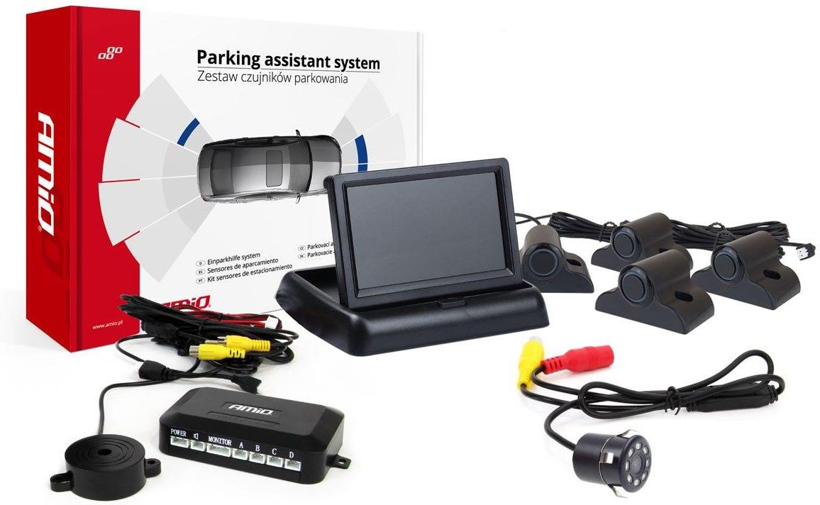 Asystent parkowania kompletny zestaw czujniki + kamera z wyświetlaczem. W skład zestawu wchodzi : wyświetlacz czujniki kamera centralka kompletne okablowanie Kamera i czujniki załączają się automatycznie w momencie wrzucenia biegu wstecznego. Czujnik parkowania stanowi niezastąpioną pomoc zarówno podczas jazdy jak i w czasie parkowania. Tylne sensory ułatwiają parkowanie nawet dużym samochodem, a wejście na kamerę cofania umożliwia nam dokładną obserwację strefy za pojazdem. Czujnik posiada wbudowany mikser wideo dzięki czemu może wyświetlać obraz z podłączonej kamery cofania i wygenerowany cyfrowo wskaźnik odległości. Urządzenie szczególnie przydatne jest na zatłoczonych parkingach, podczas opadów deszczu czy śniegu i przy ograniczonej widoczności np. w nocy. Określając nam odległość i kierunek od przeszkody możemy uniknąć niepotrzebnych wydatków i wielu nieprzyjemności spowodowanymi już najmniejszymi otarciami zderzaka.