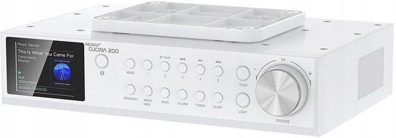 Radio kuchenne Ferguson Cucina 200 Białe Bluetooth 2x6W Wyświetlacz LCD Stereofoniczne radio kuchenne do montażu podszafkowego. Wysokiej jakości głośniki, użyteczna lampka LED, wygodne przyciski i obsługa radia FM, DAB+ oraz przesyłania dźwięku przez Bluetooth. NAJWAŻNIEJSZE PARAMETRY Stereofoniczny odbiornik radiowy: FM/DAB+/Bluetooth Moc wyjściowa audio: 2 x 6W Wbudowane oświetlenie kuchenne LED (moc 2W) Kolorowy wyświetlacz LCD Pilot zdalnego sterowania 30 programowalnych stacji FM 30 programowalnych stacji DAB/DAB+ Strumieniowe przesyłanie muzyki przez Bluetooth Timer gotowania do 240 minut Zegar z 2 oddzielnymi alarmami Zestaw do montażu pod szafką Regent Cucina 200 Regent Cucina 200 wyróżnia się wysoką jakością stereofonicznego dźwięku dzięki dwóm głośnikom o mocy 6W każdy. Przebywając w kuchni w końcu usłyszysz ulubioną muzykę bądź audycję radiową tak, jak powinny być słyszane: z odpowiednią głębią basów, czystością sopranów i w głośności, jaka Ci odpowiada. Dodatkowo możesz w każdej chwili podpiąć swój telefon czy inne urządzenie przez Bluetooth i streamować swoją ulubioną muzykę z dowolnych serwisów muzycznych. Duży, wyraźny, kolorowy wyświetlacz Regent Cucina 200 wyświetla wszystkie niezbędne w kuchni dane, takie jak aktualna godzina, pozostały czas gotowania w nastawionym timerze a nawet okładki aktualnie odtwarzanych utworów (jeśli stacja radiowa taką funkcję obsługuje). Regent Cucina 200 to także źródło światła w Twojej kuchni – przydatna lampka LED oświetli blat roboczy i pozwoli na oszczędzenie energii, bo po co uruchamiać pełne oświetlenie kuchni przy robieniu szybkiej przekąski? Nie możesz odejść od miejsca pracy a chcesz zmienić głośność, utwór lub stację radiową? Funkcjonalny pilot zdalnego sterowania zawsze jest pod ręką i pozwala na pełną obsługę odbiornika. Nareszcie kuchnia to także miejsce zabawy a nie tylko pracy! Zwarta bryła Regent Cucina 200 oferuje wygodny dostęp do najważniejszych swoich funkcji. Montaż podszawkowy jest banalnie prosty dzięki dostarczanemu wraz z odbiornikiem zestawowi do montażu pod szafką. Front urządzenia zdobi duży, wyraźny, jasny (natężenie jasności można zmieniać) i kolorowy wyświetlacz LCD. Spód odbiornika to miejsce, z którego rozchodzi się dźwięk oraz gdzie znajduje się poręczna lampka LED. SPECYFIKACJA TECHNICZNA Stereofoniczny odbiornik radiowy FM/DAB/DAB+ Strumieniowe przesyłanie muzyki przez Bluetooth Kolorowy wyświetlacz LCD Moc wyjściowa 2 x 6W Wbudowana lampa kuchenna LED Uchwyt do montażu pod szafką (w zestawie) Pilot zdalnego sterowania Zasilanie: Wejście: 100-240V AC, 50/60Hz, MAX 1A; DC 9V 2A (adapter w zestawie) Pobór mocy: Praca ⋖ 18W; Tryb gotowości ⋖ 1,0W Moc diody LED: 2W Pasmo częstotliwości: DAB+ (Band III): 174,928 – 239,2MHz; FM: 87,5 – 108MHz; Bluetooth: 2,402 – 2,480GHz Pamięć stacji: DAB/DAB+: 30 zaprogramowanych stacji; FM: 30 zaprogramowanych stacji Wyjścia zasilania: 6W + 6W (przy 4Ω, 10% zniekształceń harmonicznych) Głośnik: Średnica 41 mm (1,6 cala), 4Ω, typ stożkowy (2) Maksymalna transmitowana moc: ⋖ 5dbm (EIRP) Wyświetlacz: 2,8” kolorowy wyświetlacz LCD Pilot zdalnego sterowania: Zakres kontroli: Maks. 5 metrów odległości liniowej; Bateria: Rozmiar AAA, DC 1,5V x 2 sztuki Wilgotność podczas pracy: 40 – 85% Temperatura otoczenia podczas pracy: 10 – 40°C Wymiary: 297 x 190 x 76,3mm Waga: 1,39kg