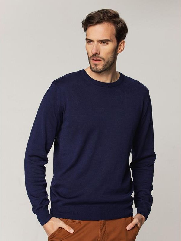 Sweter męski Willsoor Kolor: granatowy Dekolt: okrągły (typ O-neck) Skład: 50% bawełna, 50% akryl Rękawy wykończone ściągaczem Dół wykończony ściągaczem Elastyczna tkanina, prosty fason Jakość: pierwsza Gwarancja: 24 m-ce