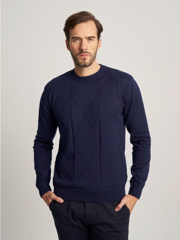 Sweter męski Willsoor Kolor: granatowy w geometryczny wzór Dekolt: okrągły (typ O-neck) Skład: 50% bawełna, 50% akryl Rękawy wykończone ściągaczem Dół wykończony ściągaczem Elastyczna tkanina, prosty fason Jakość: pierwsza Gwarancja: 24 m-ce